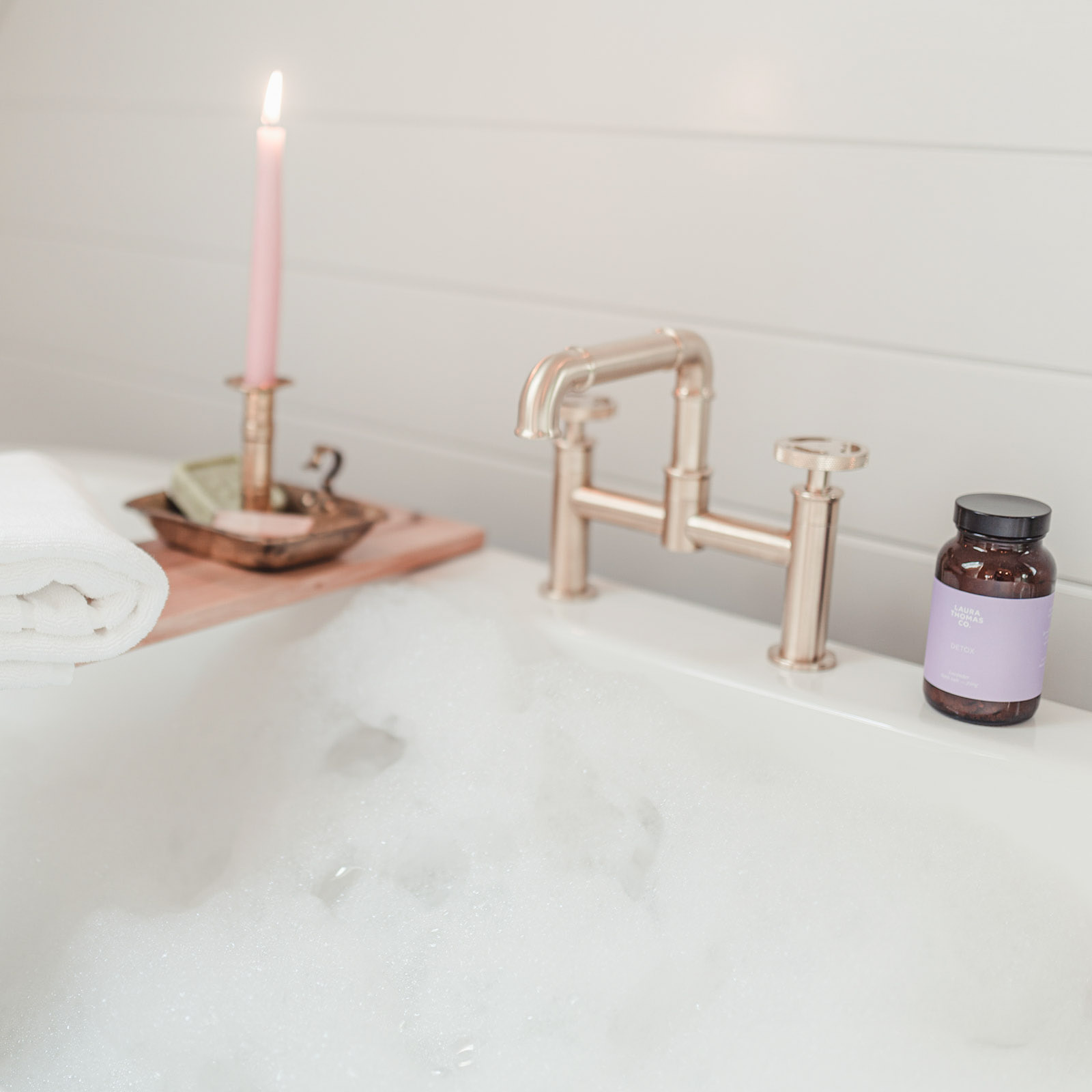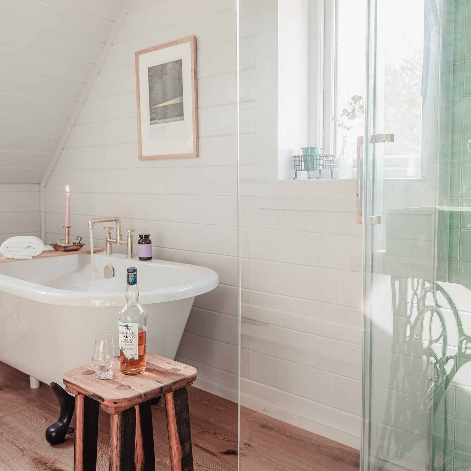- Bathroom with rolltop bath and rainfall shower; Laura Thomas toiletries