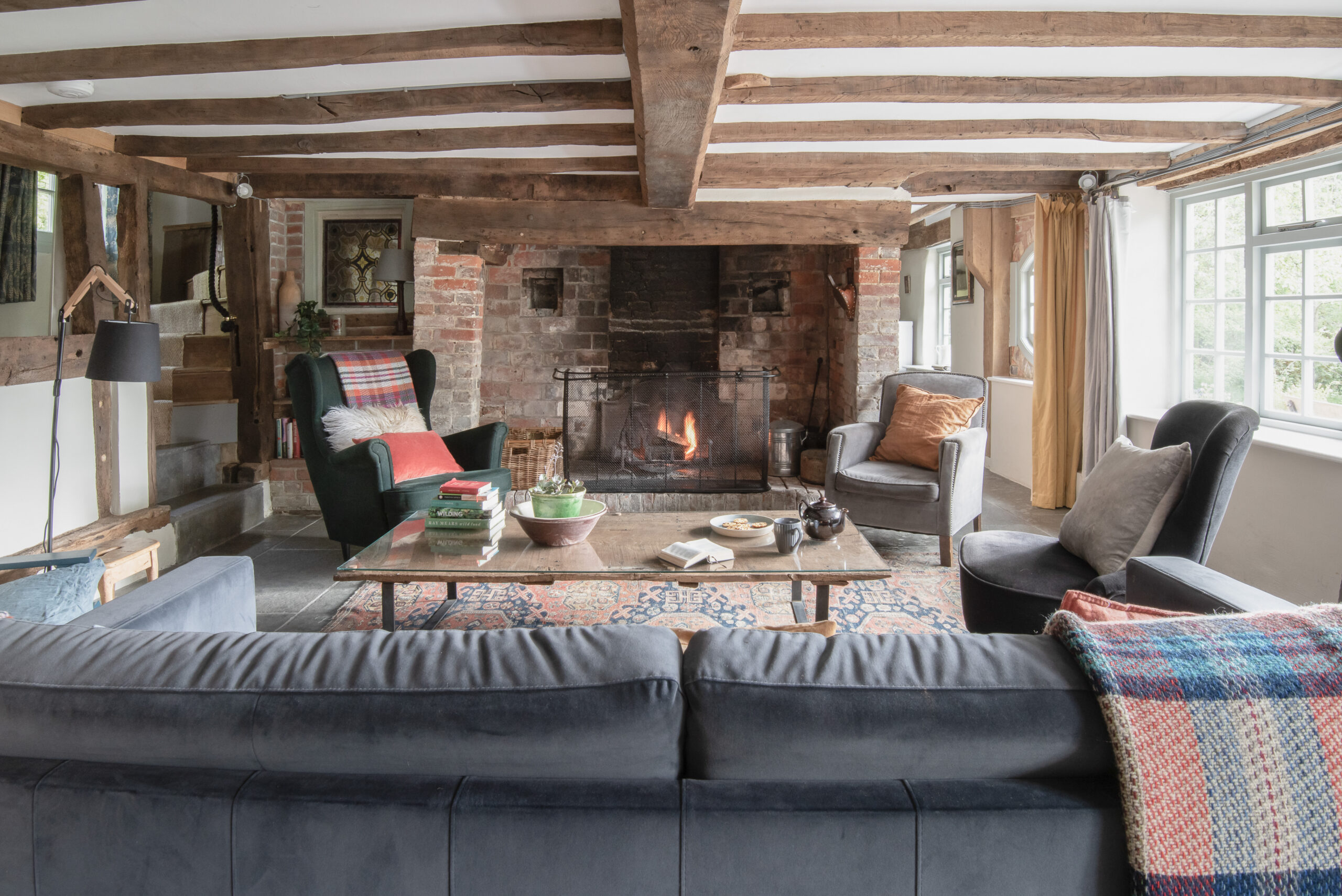 - Living room warmed by a large fireplace