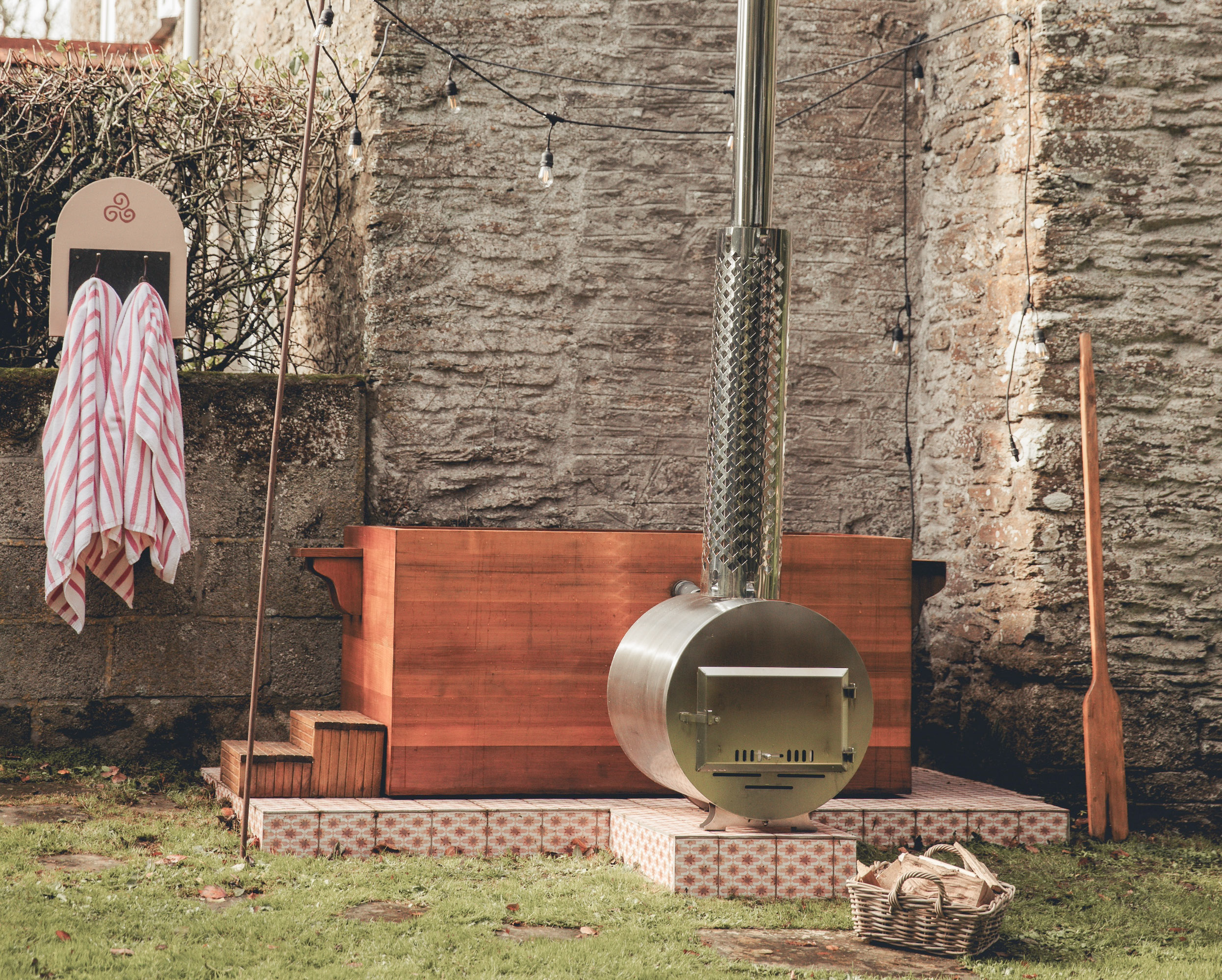 Sleeps 2: kingsize bed, bathroom with walk-in shower, kitchenette (combi oven/microwave, 2 electric hobs, fridge with ice box, toaster, kettle & Nespresso). Private terrace with wood-fired bath, lounge chairs & firepit. 1 dog welcome.