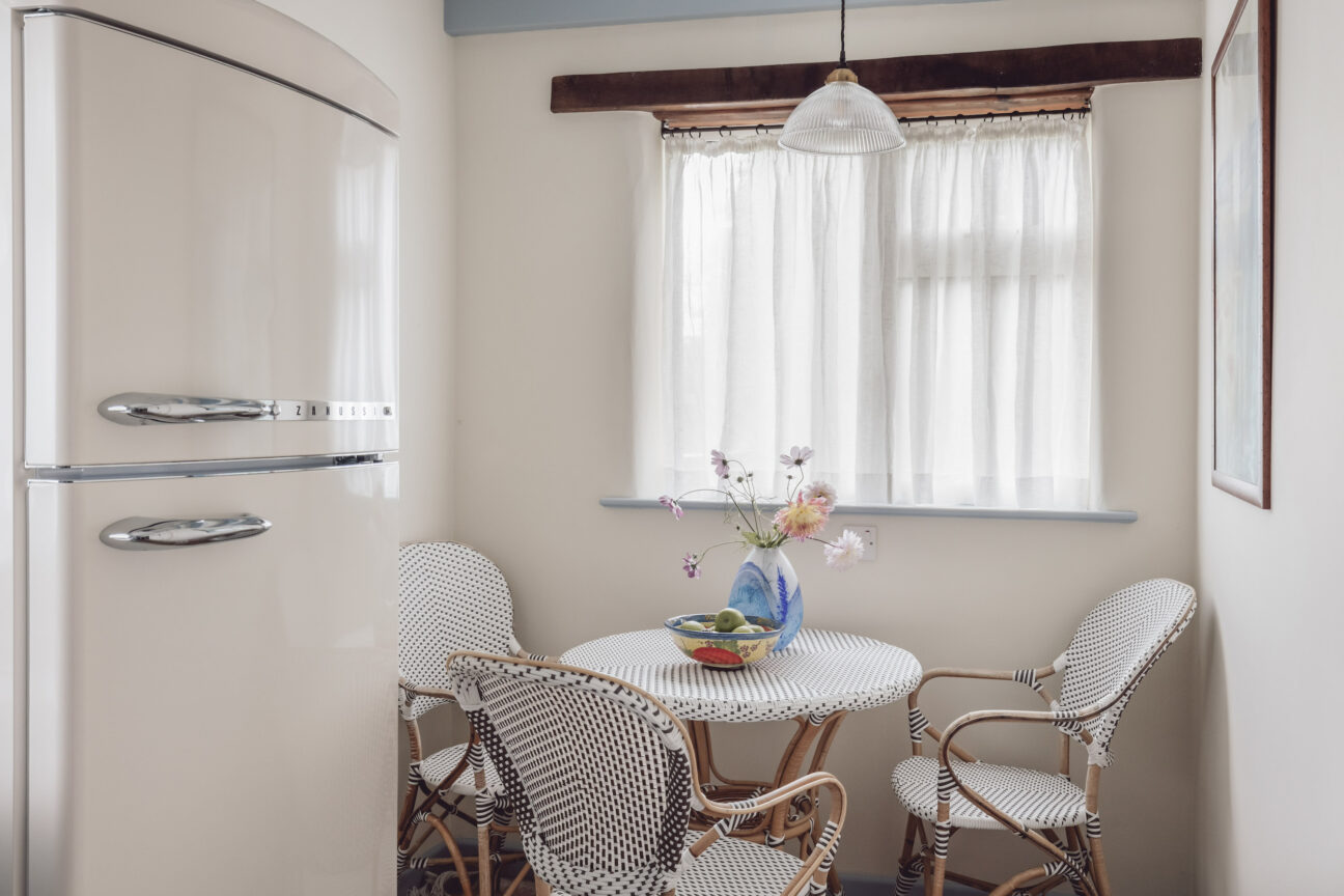 Sleeps 2 + baby: bedroom with super-kingsize or twin beds, bathroom with shower/tub, full kitchen (oven, grill, hob, fridge/freezer, kettle, toaster, Nespresso & microwave), private garden with lounge chairs & firepit.