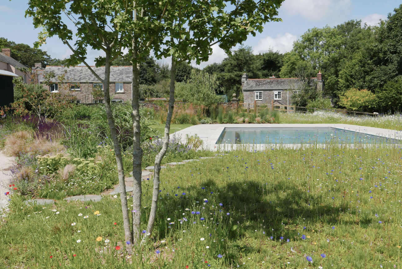 The gorgeous wildflower gardens by Darren Hawkes, which wrap around the pool, Shepherd’s Hut saunas and yoga studio.