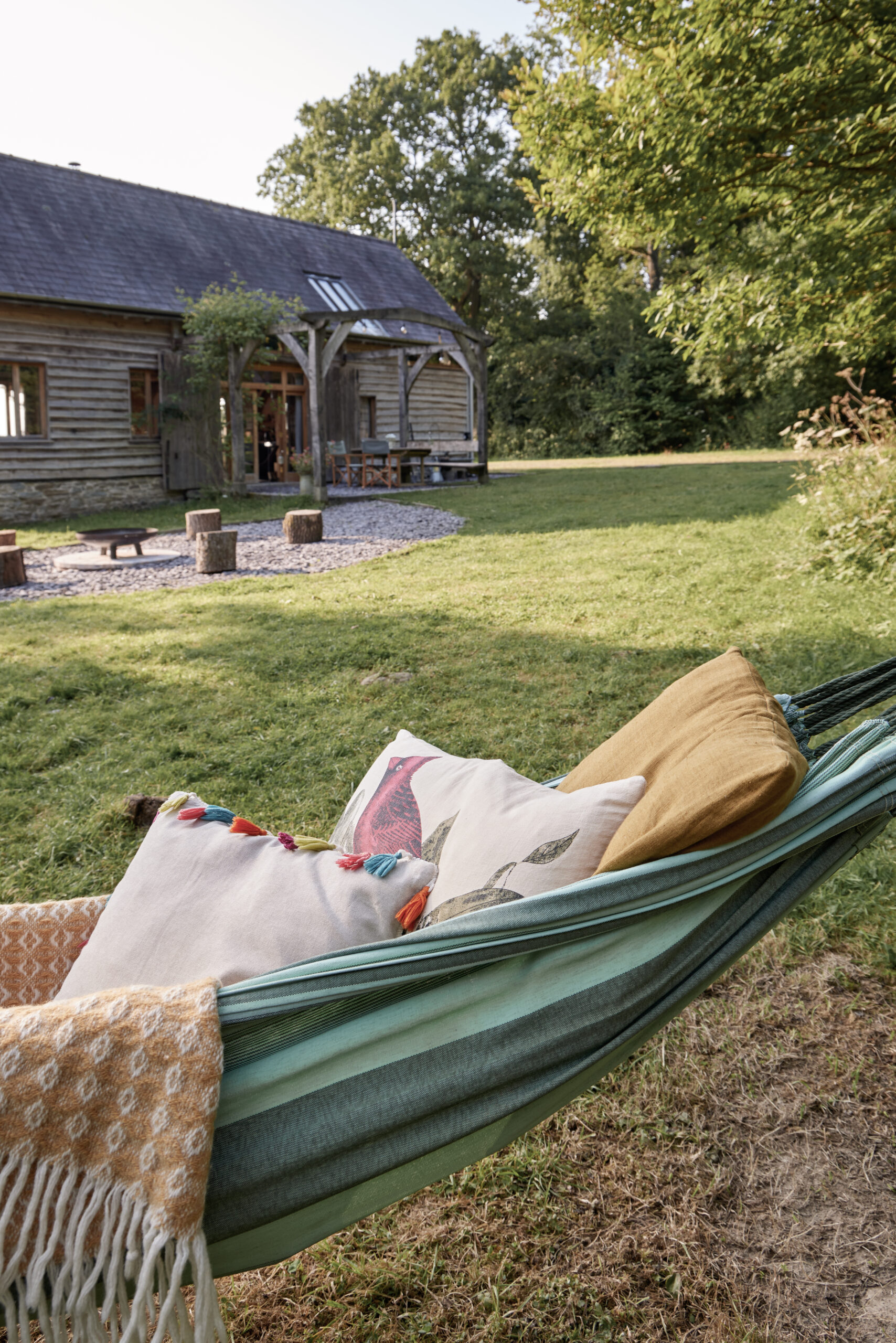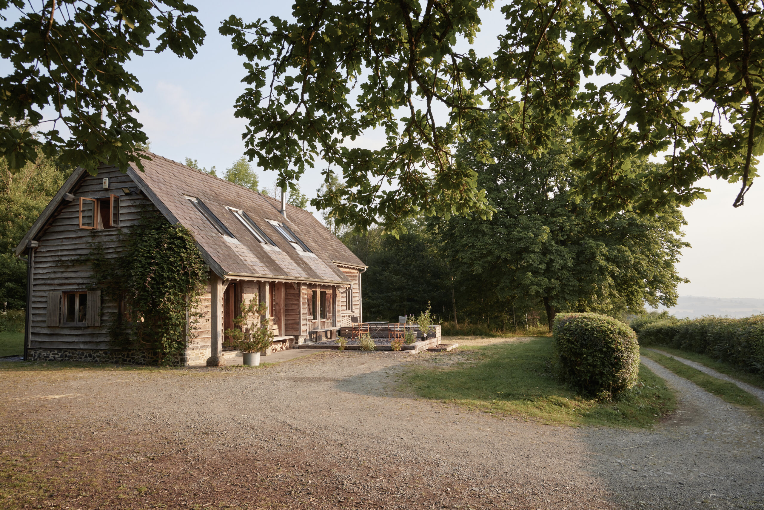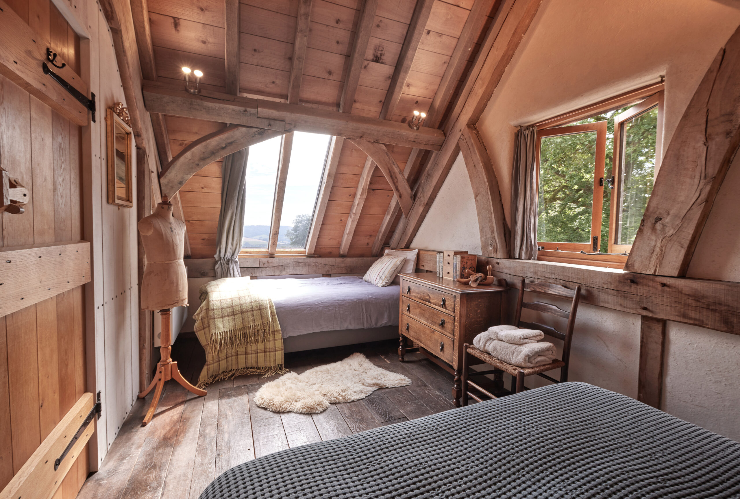 In their 20s, the owners and friends, John and David, dreamt of building an oak-framed building using traditional methods; when they stumbled across a woodland for sale near them it felt like fate. They built this barn by hand, starting with spades to dig the foundations, and felling 100 oaks from the surrounding woodland. It took several years to complete.