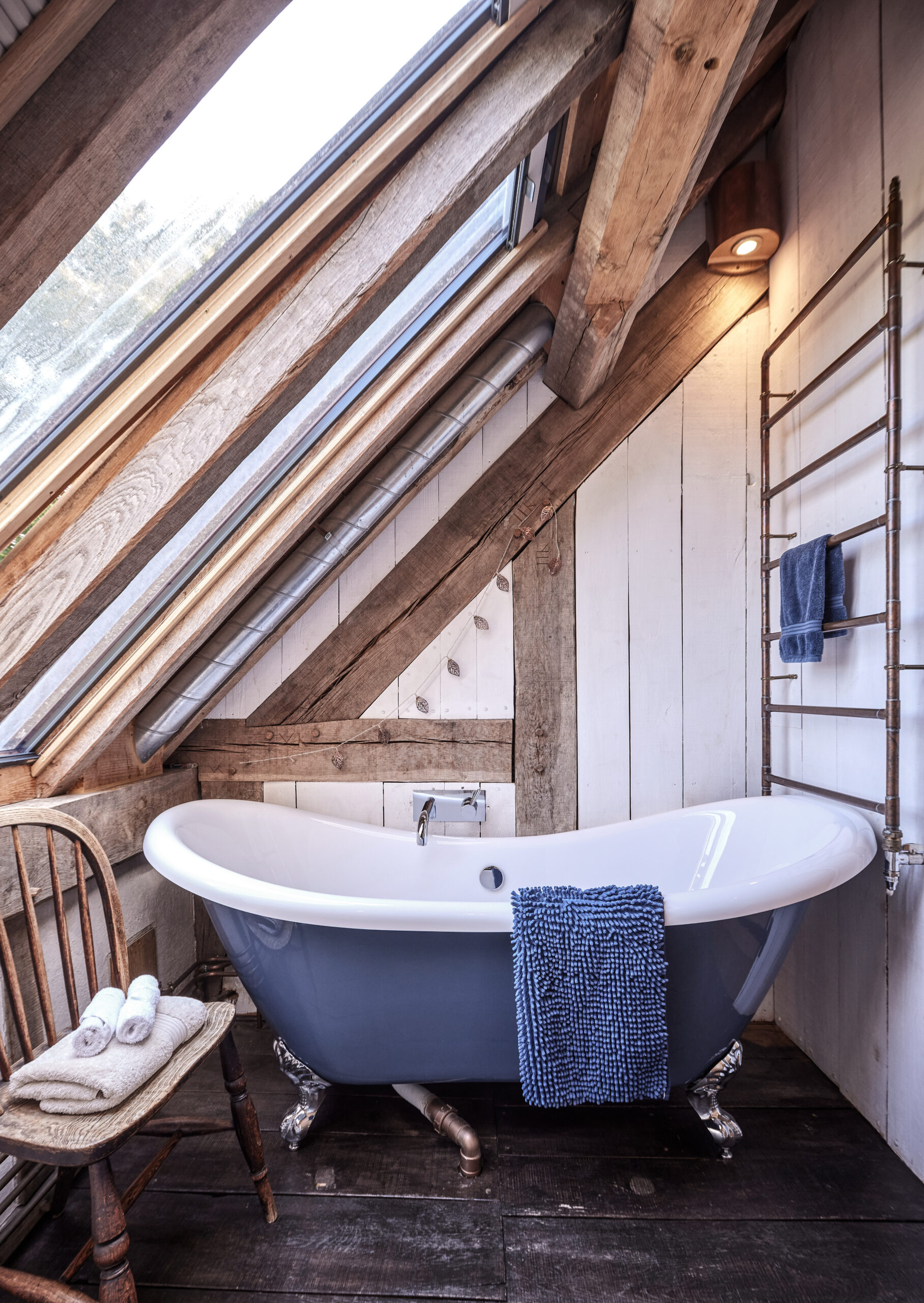 The gorgeous copper-piping taps and that tiny bathroom, with its rolltop bath and views of the sky.