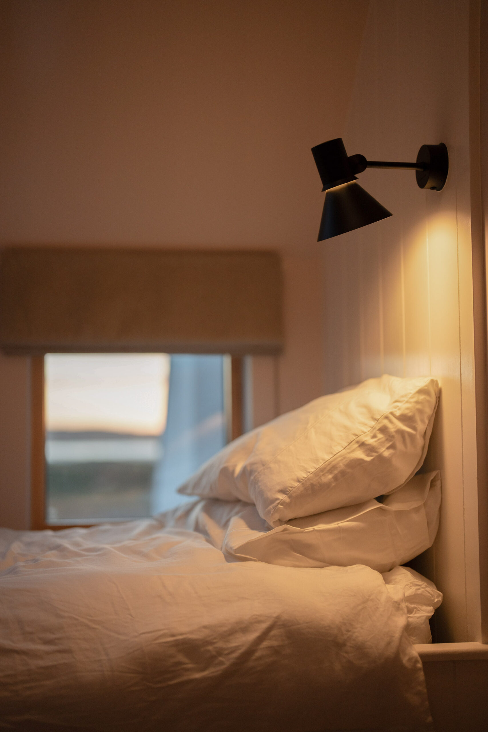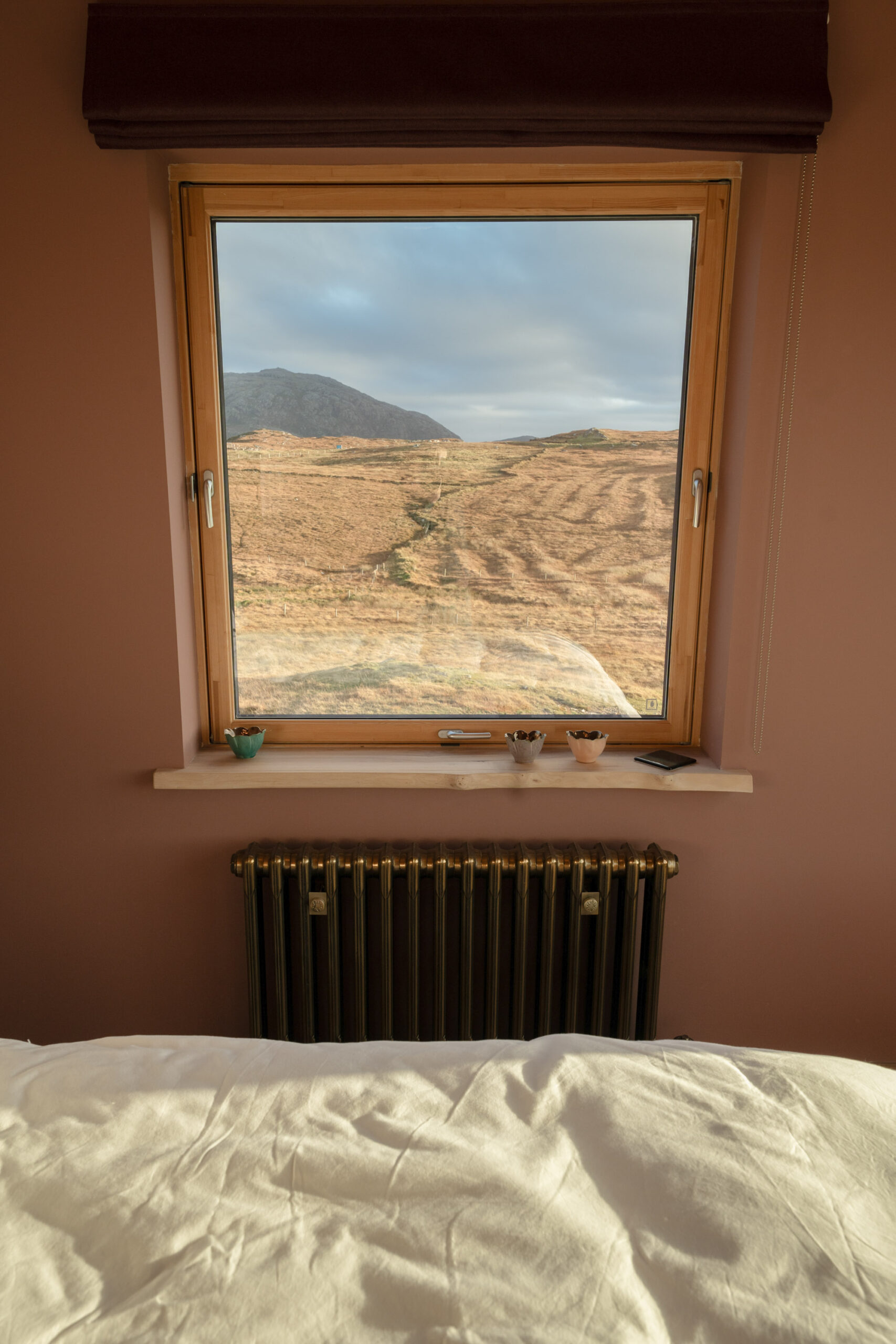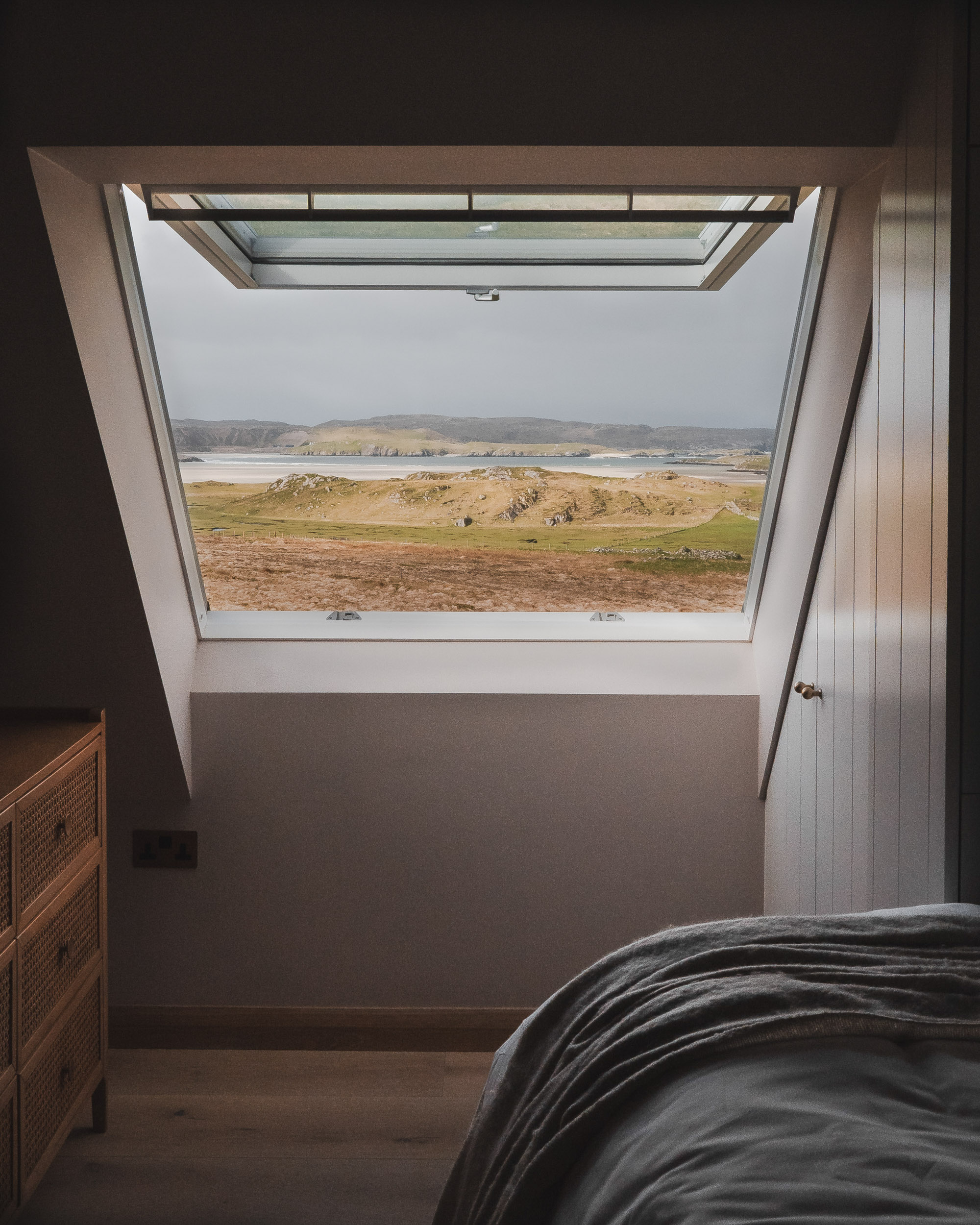 The romantic kingsized cabin bed in the annexe, from which you can look out over Uig Sands via the enormous window.