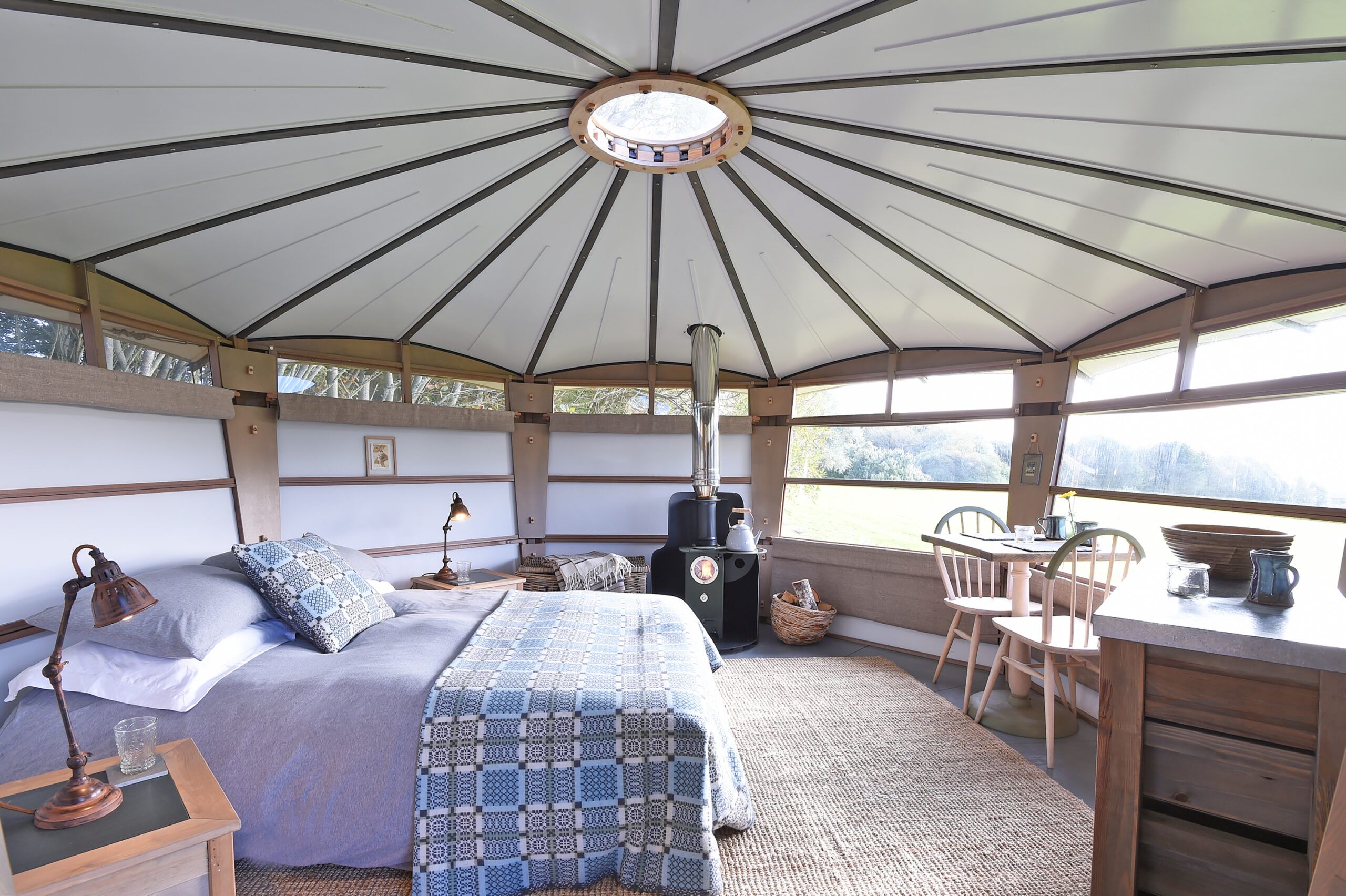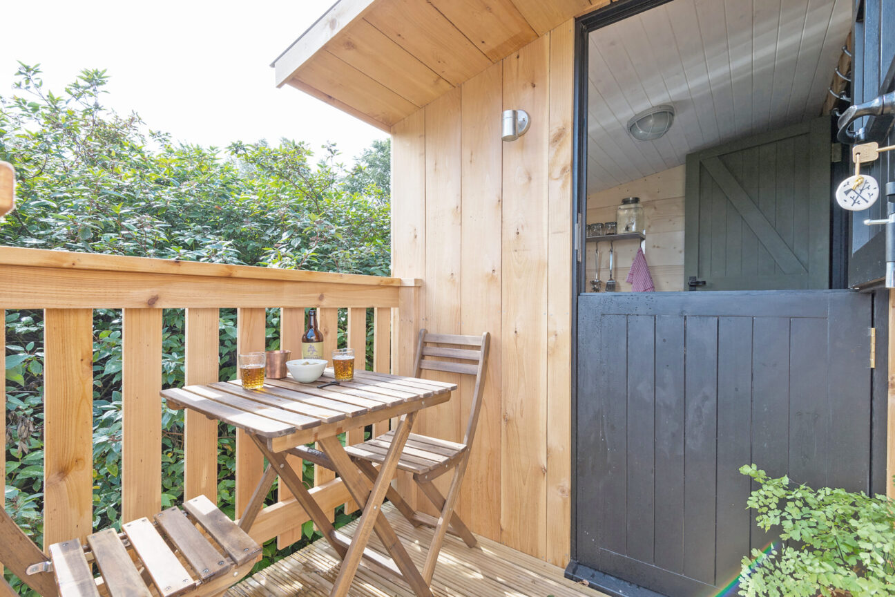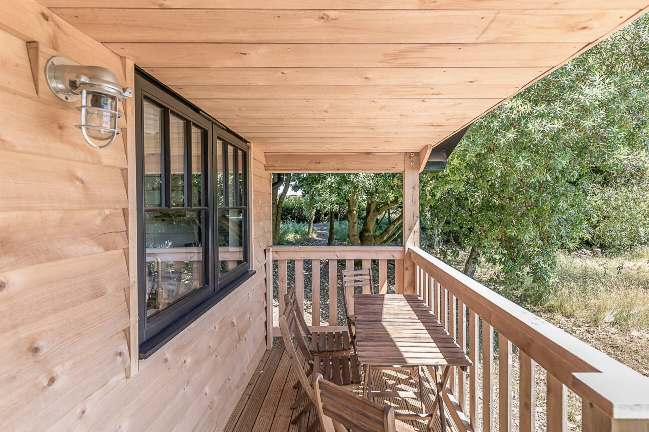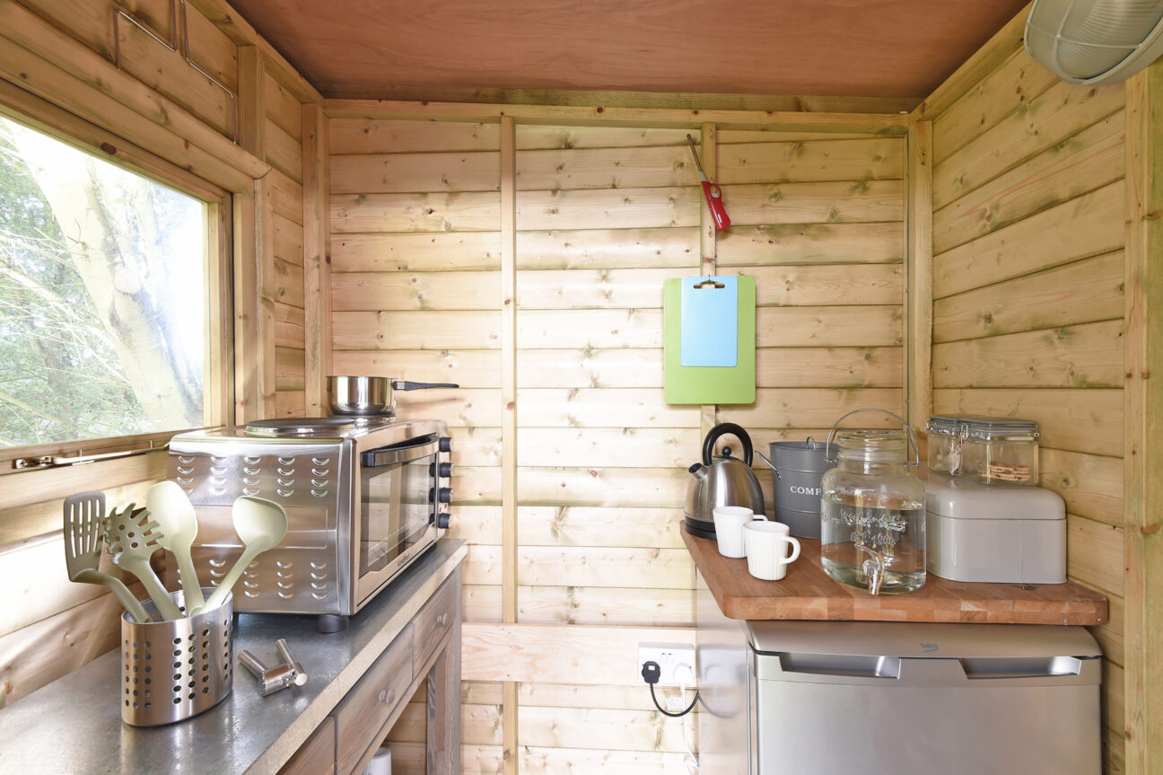 • Pavilion Cabin (sleeps 2-4): Superkingsize/twin beds + 2 single beds, bathroom with walk-in shower, open-plan living area warmed by a woodburner, full kitchen and dining table