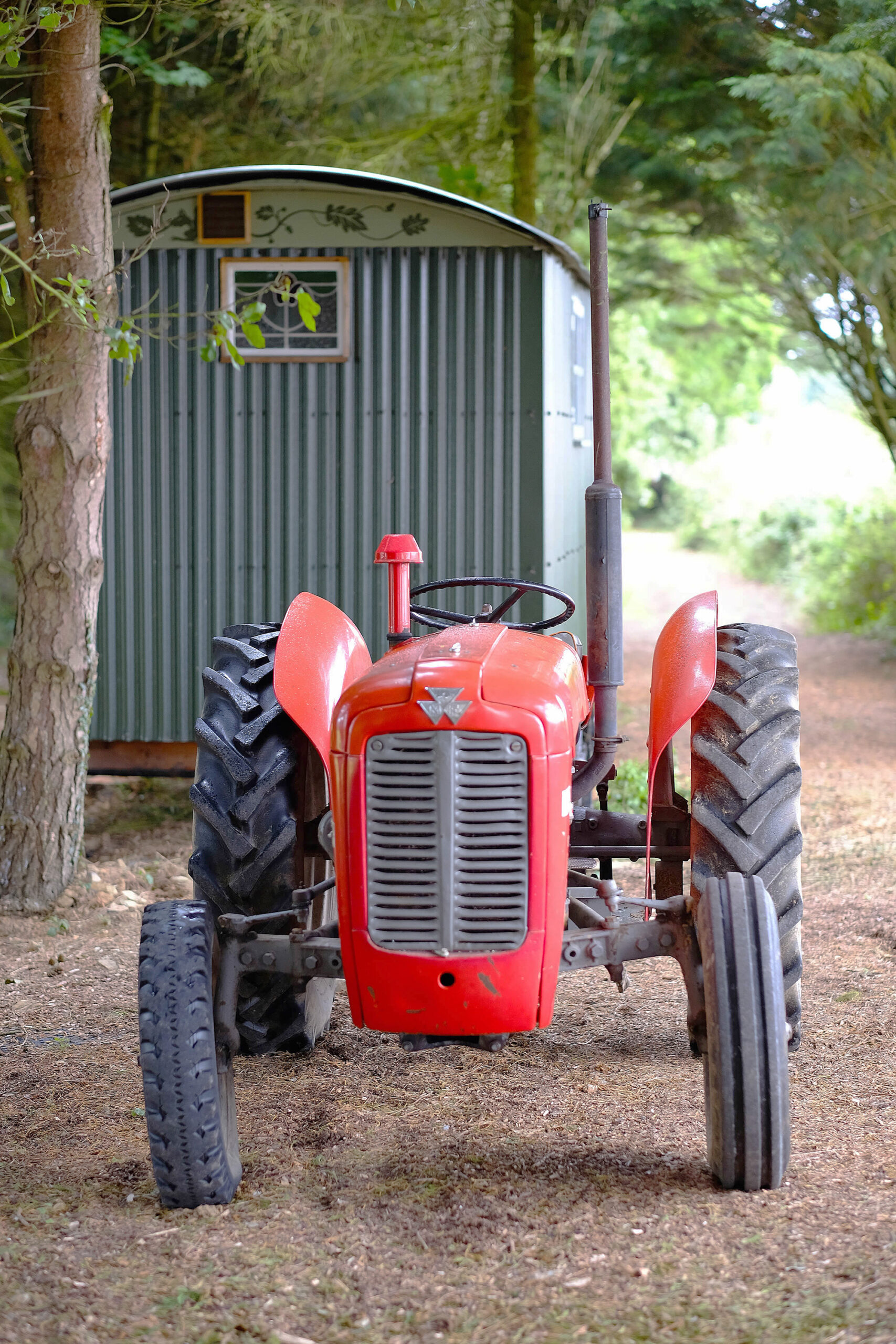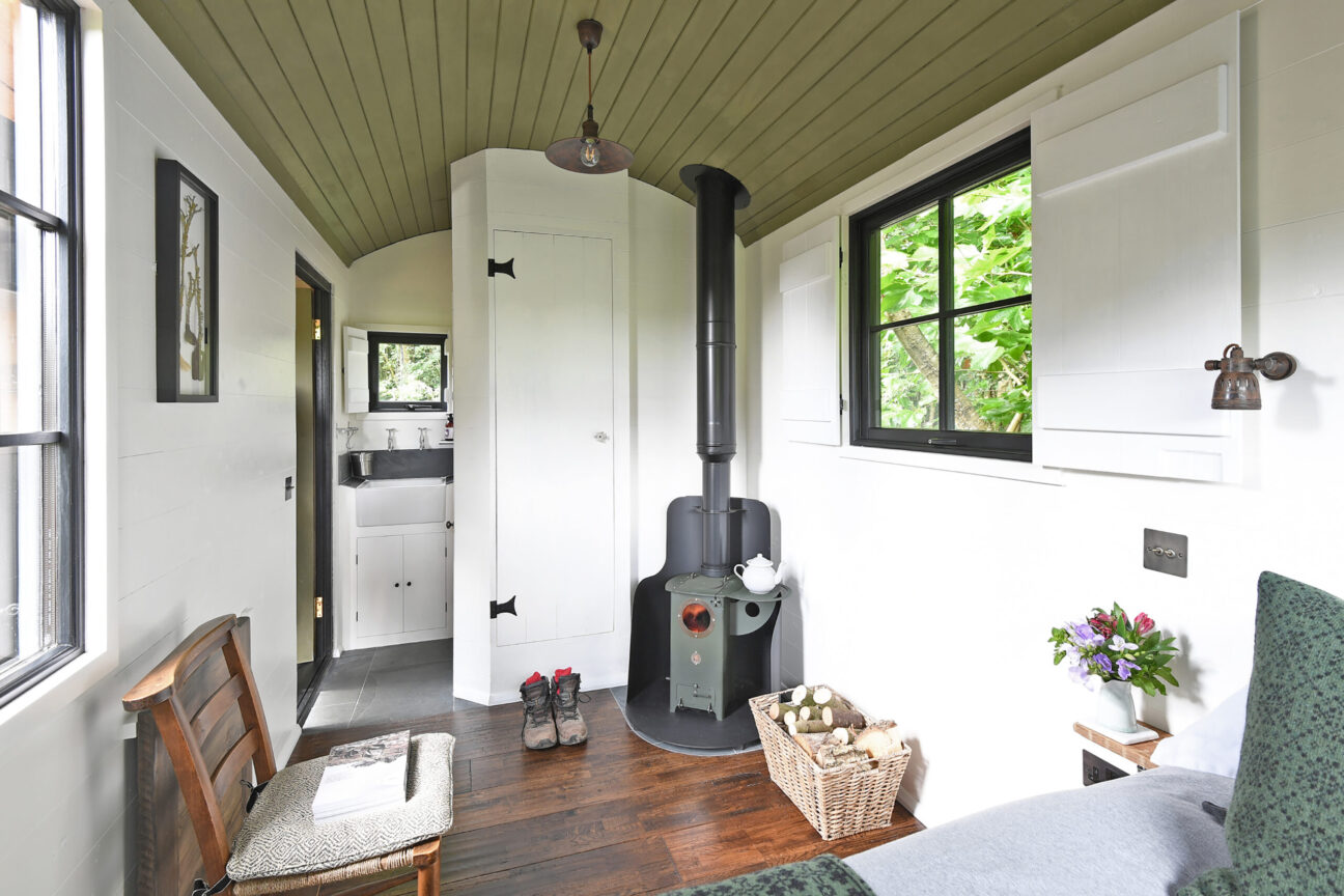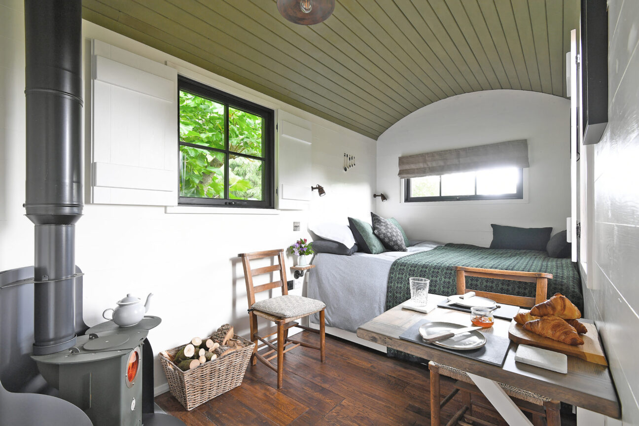• Shepherd’s Hut (sleeps 2): open-plan layout warmed by a woodburner; double bed, shower bathroom, kitchen annexe (fridge, mini electric oven and hob), terrace and BBQ