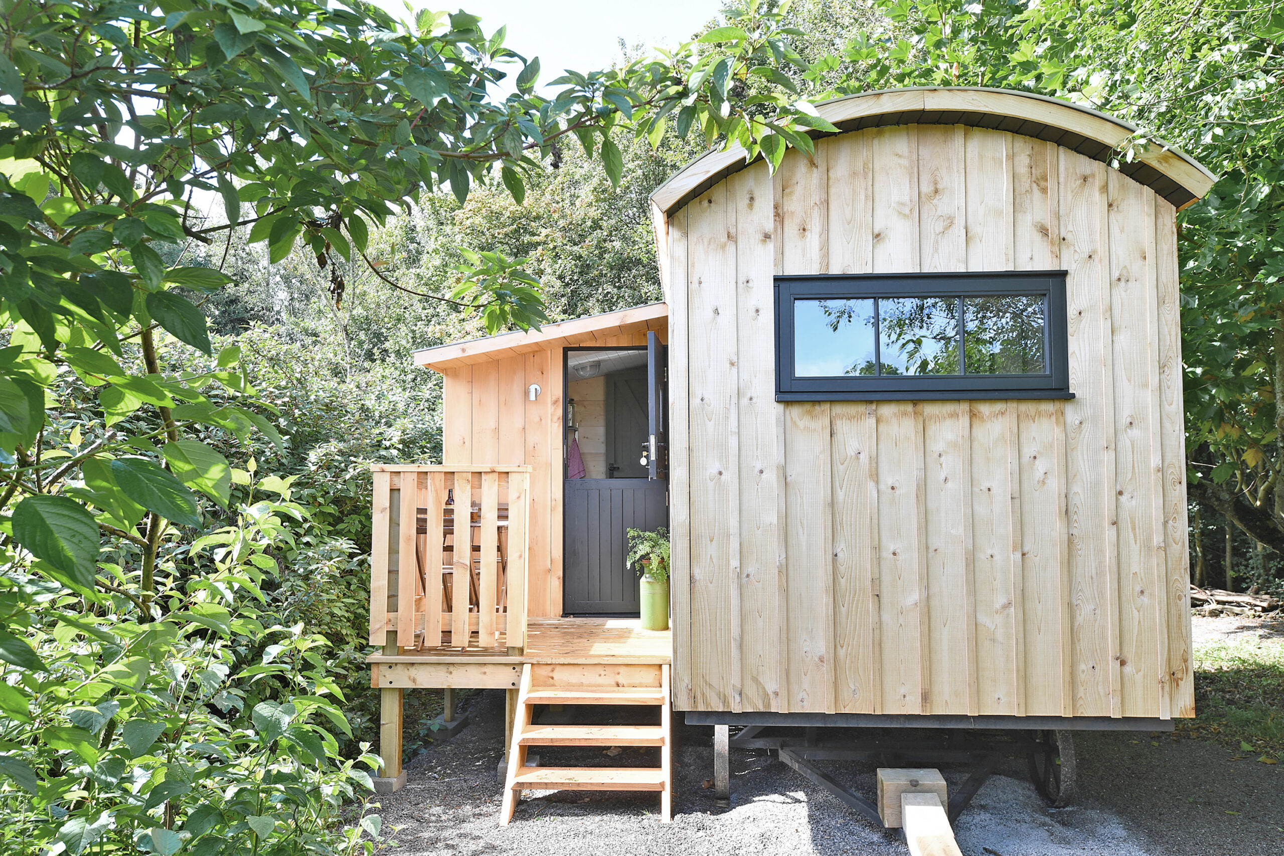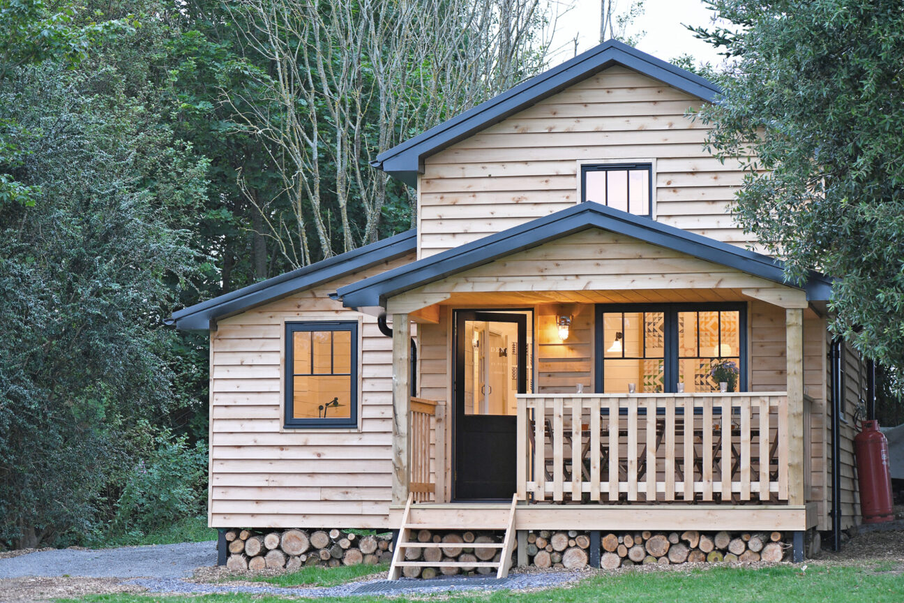 • Walden Lodge (sleeps 2-4):Double bed downstairs + double and single bunk upstairs; bathroom with walk-in shower, o>pen-plan living area warmed by a woodburner, full kitchen and dining table, terrace and BBQ