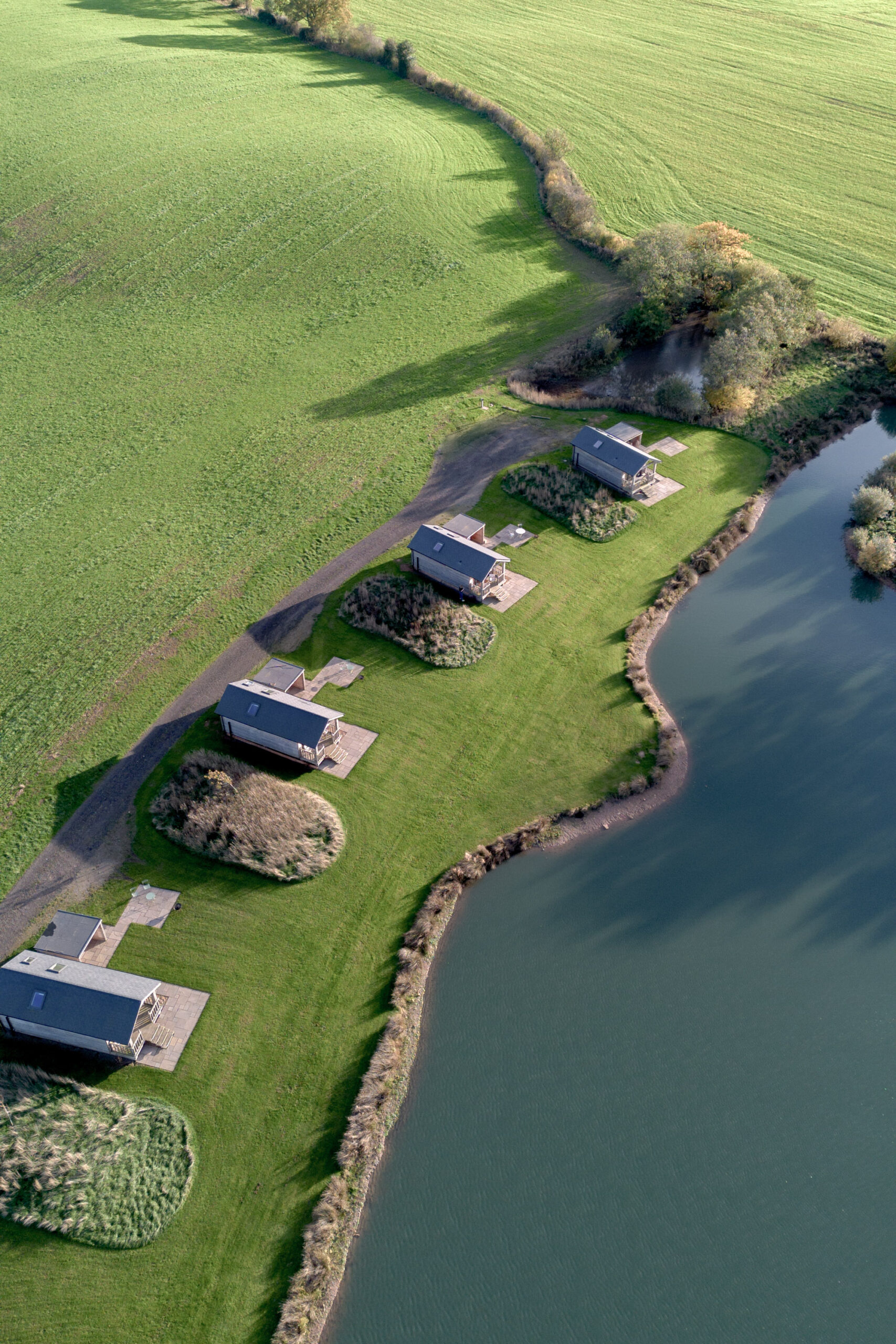 - Four standalone cabins by a lake on a family farm