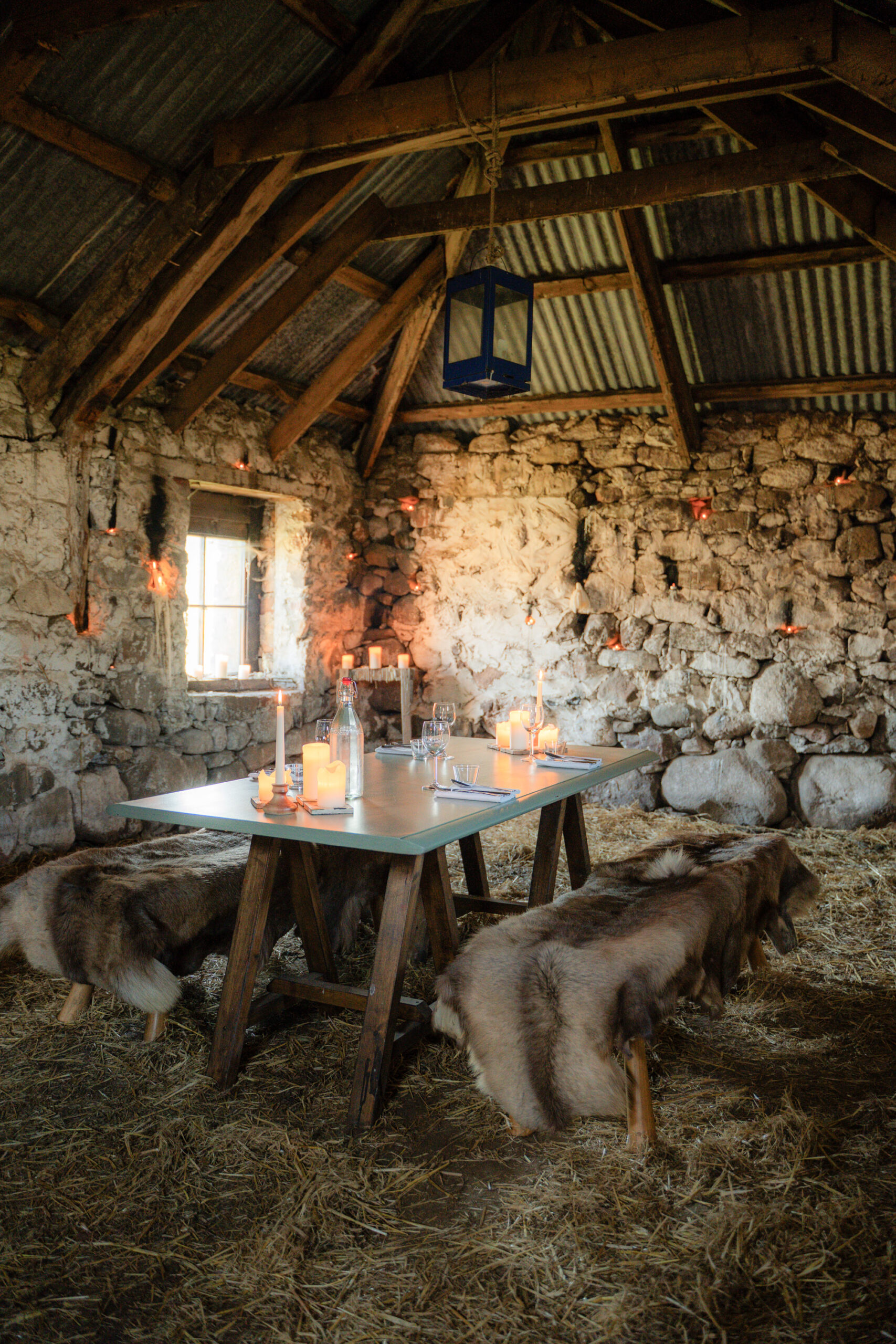 - Indoor table, sofa and woodburner