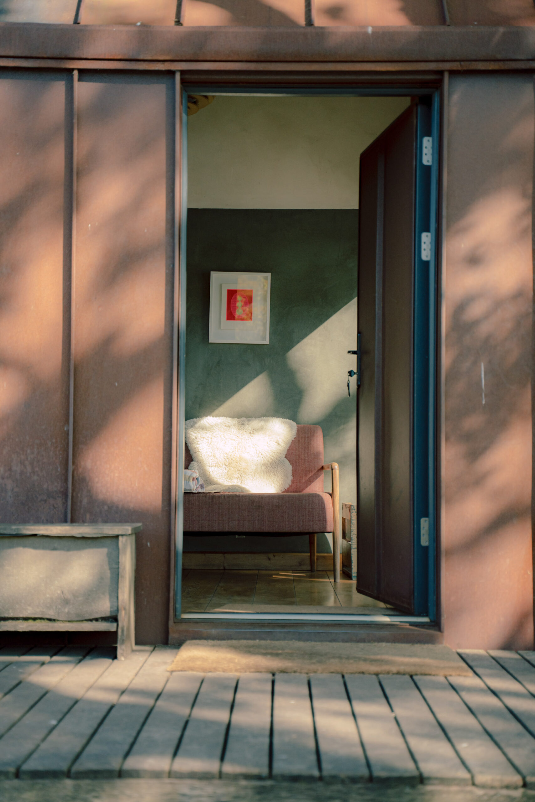Sitheil (She-Eel). Newest cabin. Textured, black Arakabe clay walls with golden flecks of straw. Expansive views across the loch. Closest to the beach and the hidden sauna. Sleeps 2.