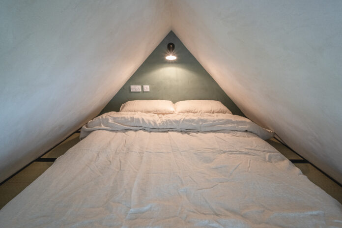 - Open-plan interior with sofa and kitchen downstairs and a mezzanine bedroom