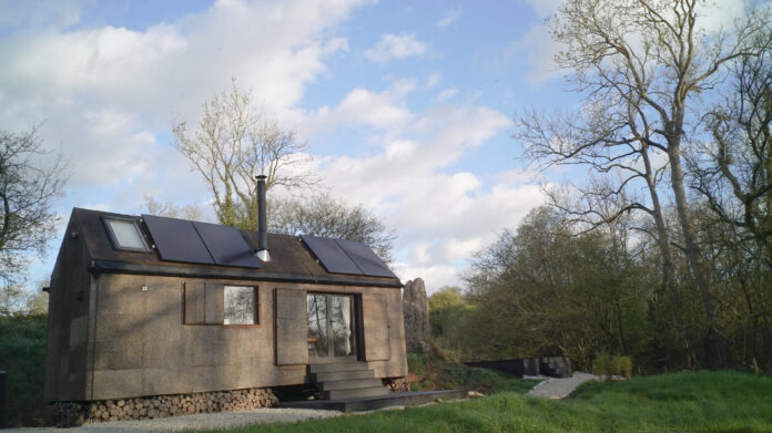 Fully off-grid. Solar-powered electricity and hot water. Cork cladding and high levels of sheep’s wool insulation. (Note: connected to the mains water). Grey water recycling system. Composting toilet.