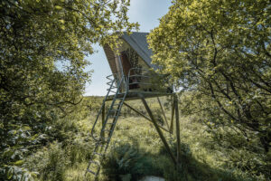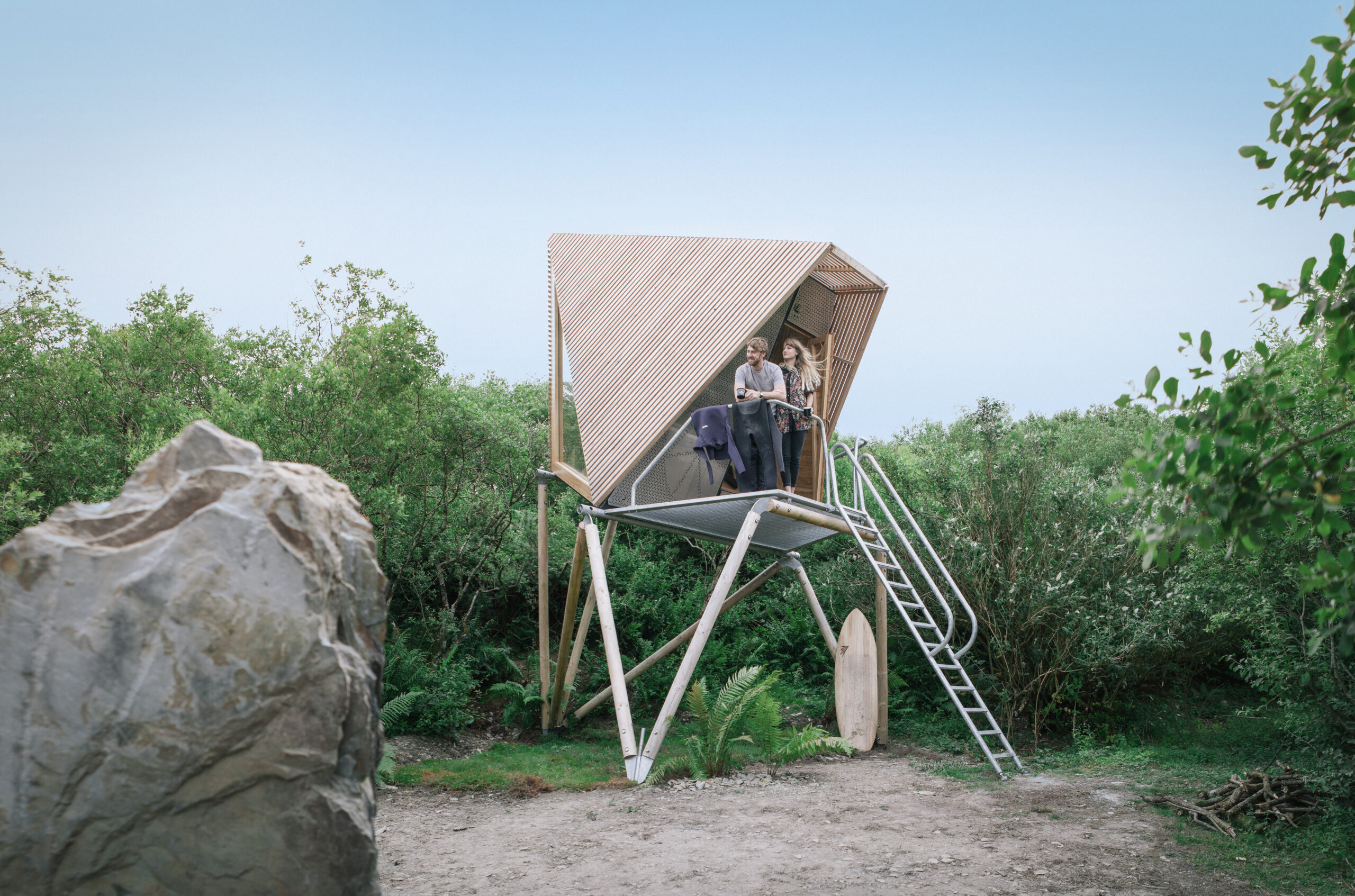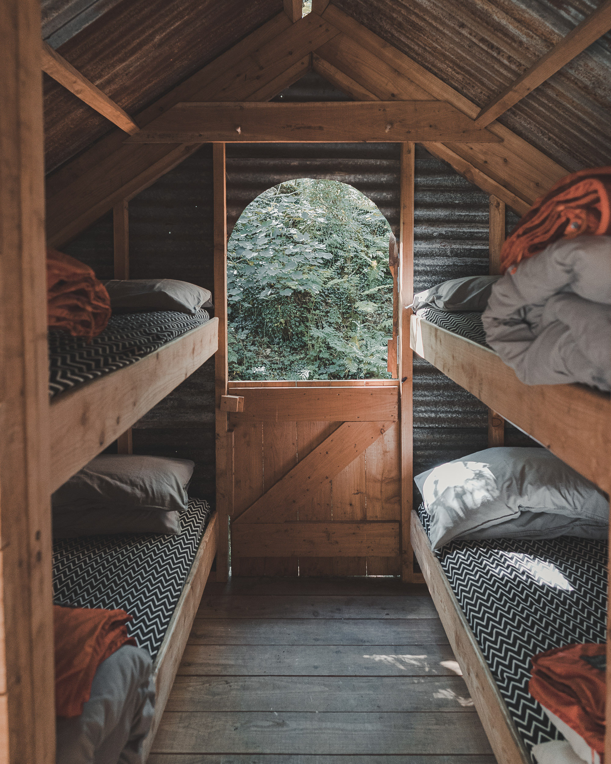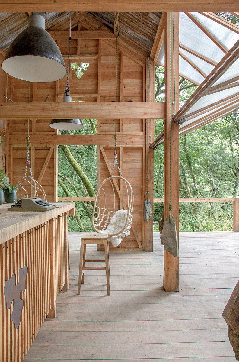Stilted hut with mezzanine double bed + sofa area. Sleeps 2. Dog-friendly (on request).