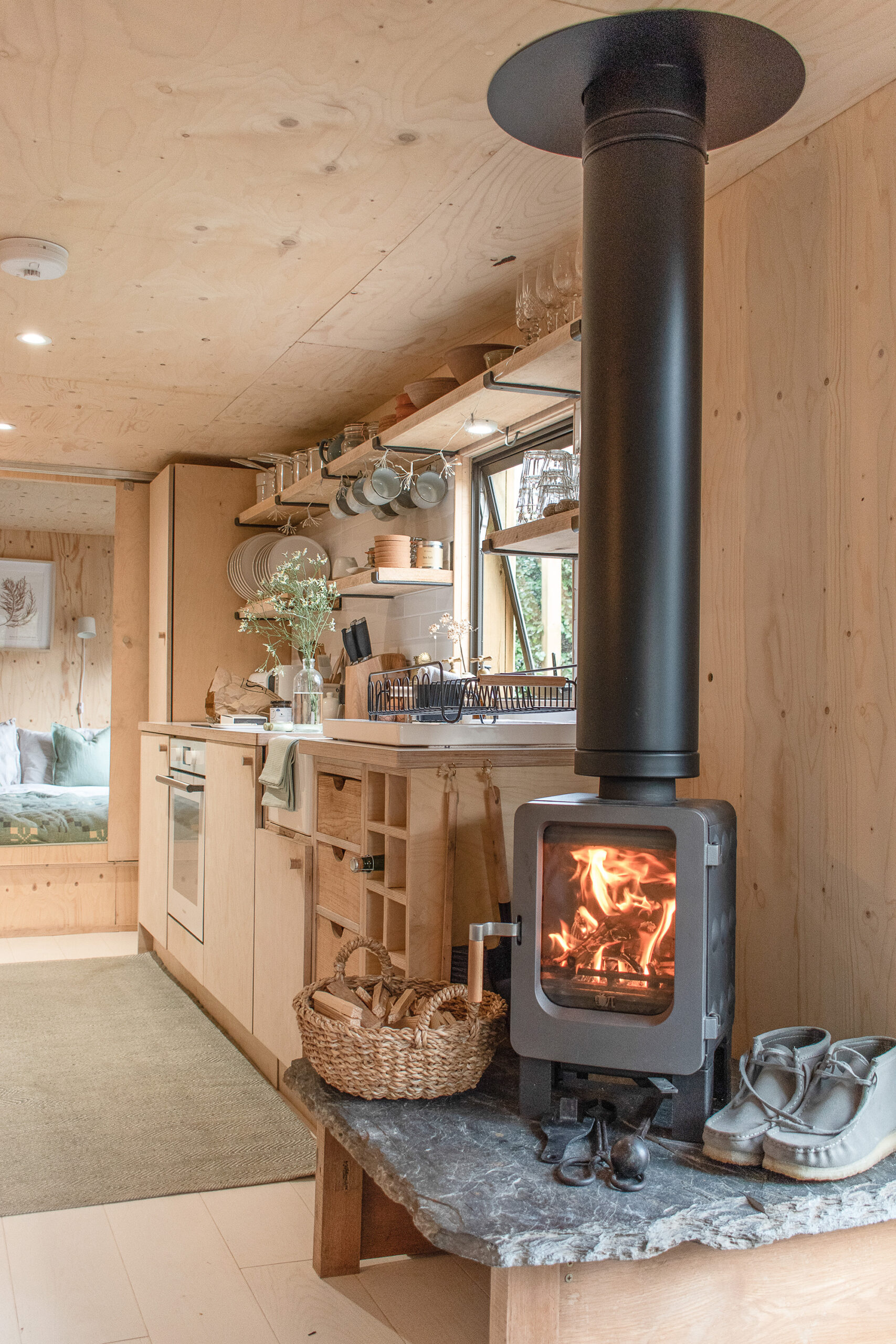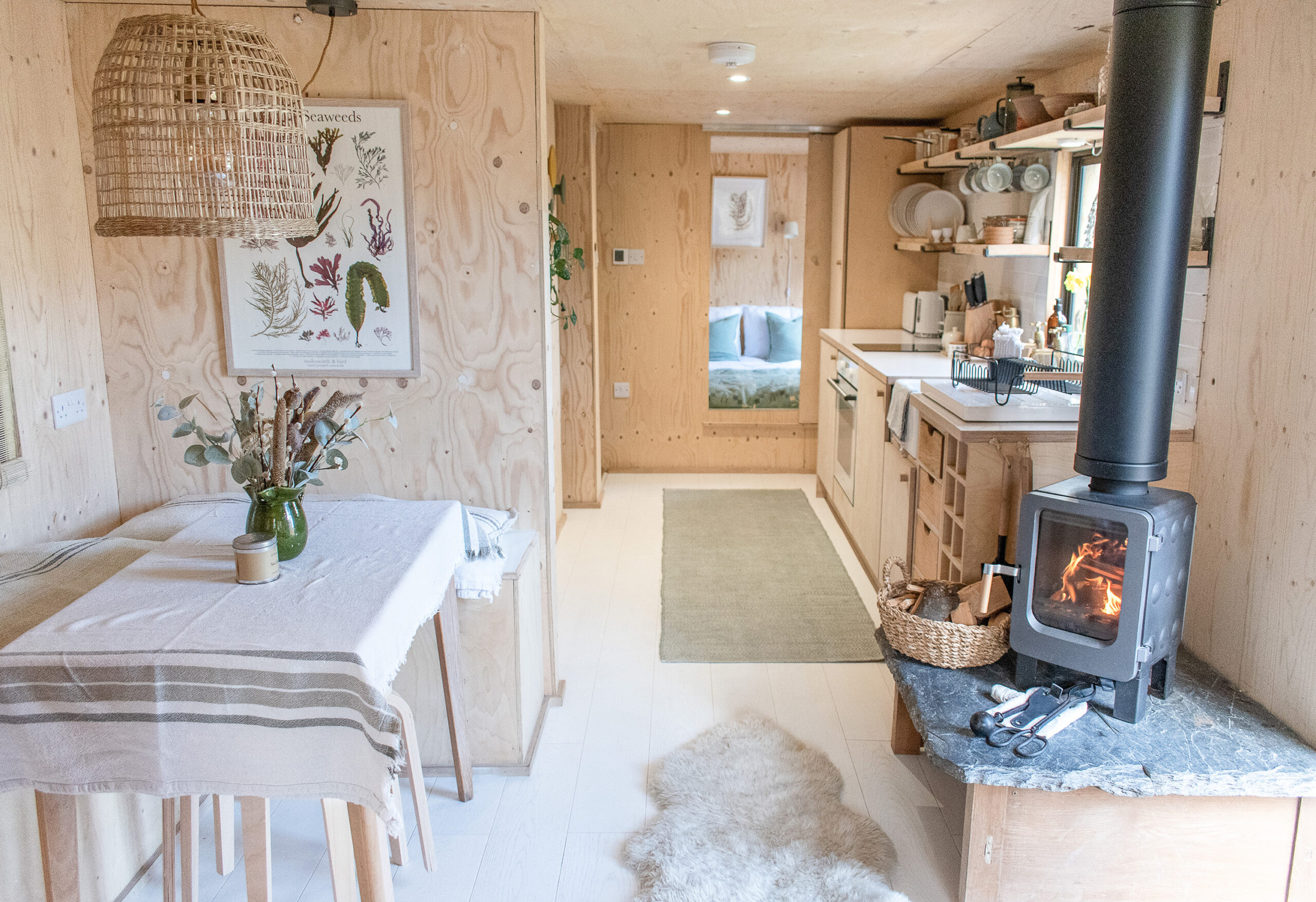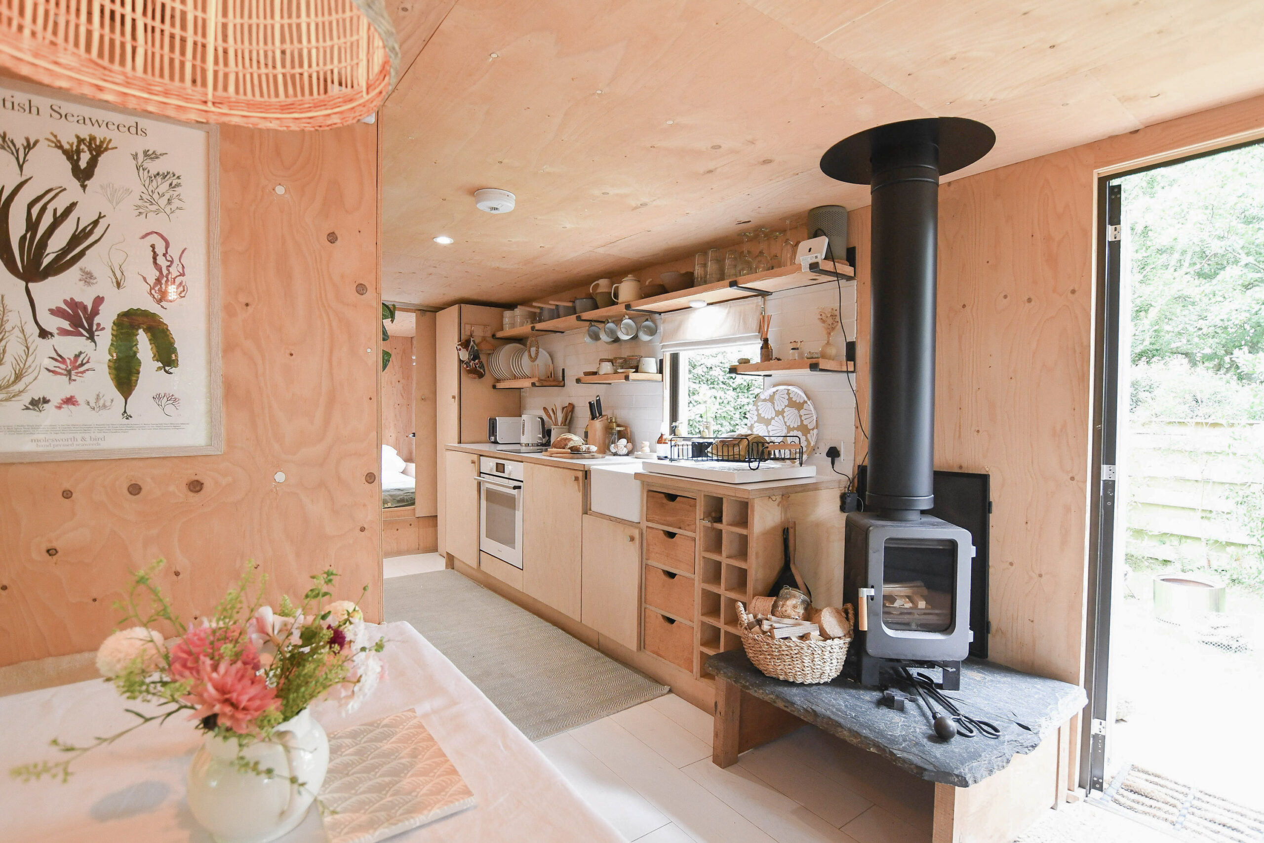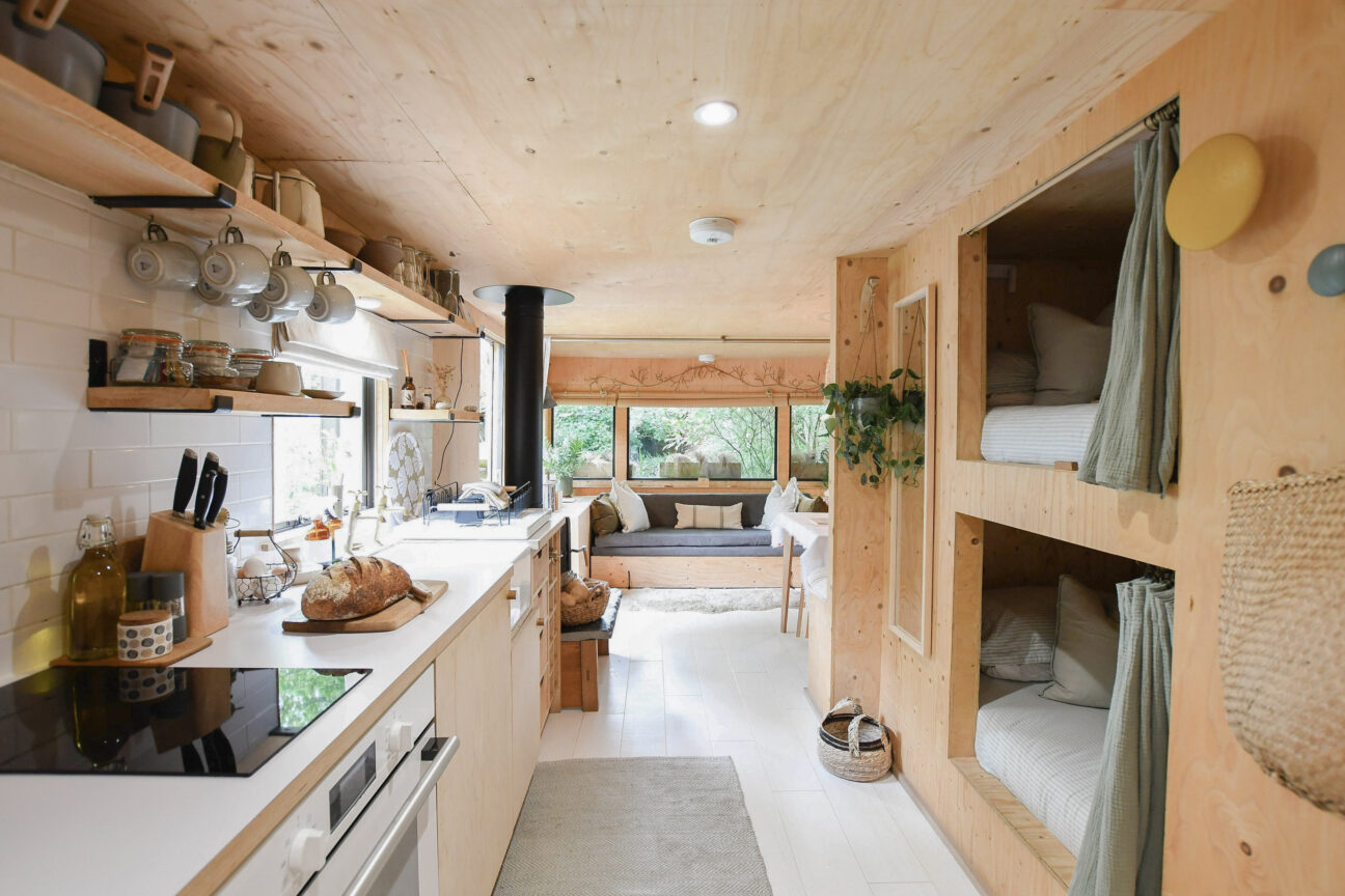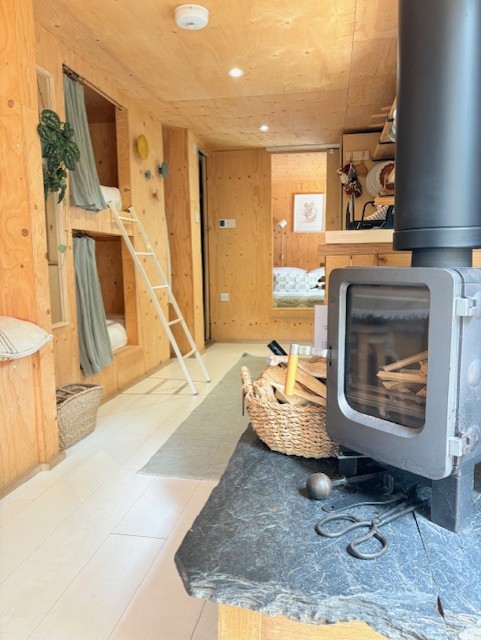 “We used a humdrum static caravan to provide the inner frame, and sustainably sourced materials inside and out to create a more pleasing aesthetic. Furnishings and produces are ethically or locally sourced. Our Eco-designed Ekol Apple pie woodburner is perfect for heating smaller spaces efficiently and we supply Lekto compressed wood fuel harvested from sustainable plantations and with no harmful chemicals. The waste ash is then thrown onto our compost.”