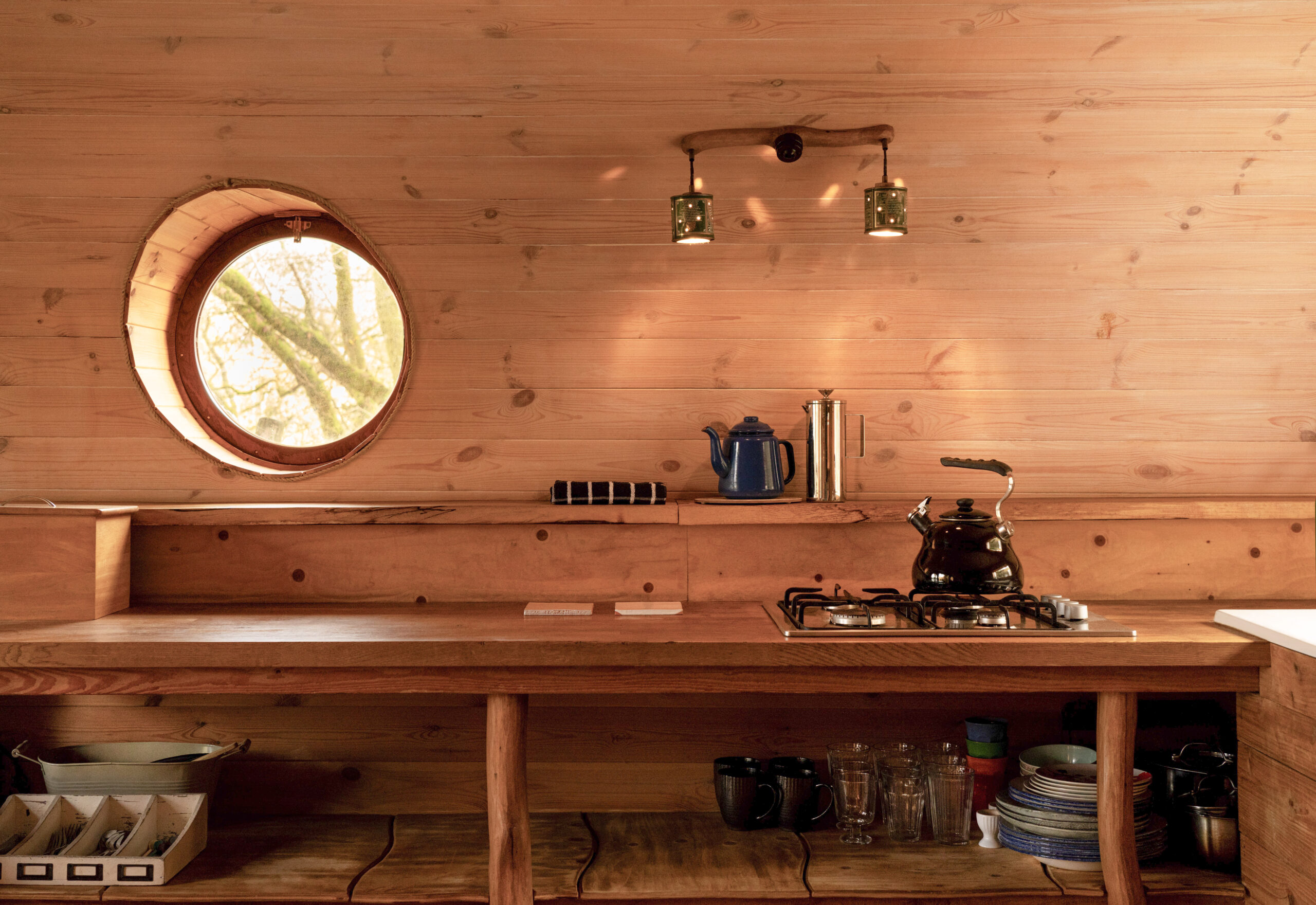 A 2-burner gas hob with all the pans you’ll need. There’s no oven but the wood-burning stove can be used for baked potatoes. You also get an innovative water-powered fridge.