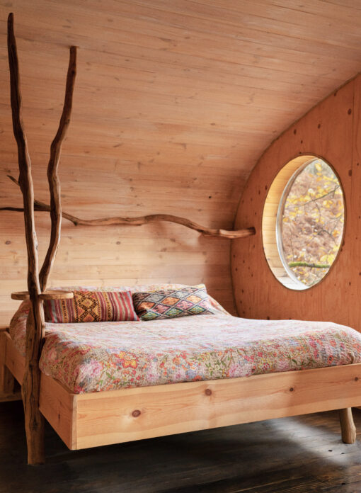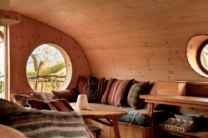 Owner Mark builds the treehouses himself, working with designer Peter (formerly one of the chief designers at the Science Museum in London) and a collective of local artisans, crafts people and eco builders. The idea for the business — like all the best business ideas — was born in the pub, and Mark has now been building treehouses for 11 years.
