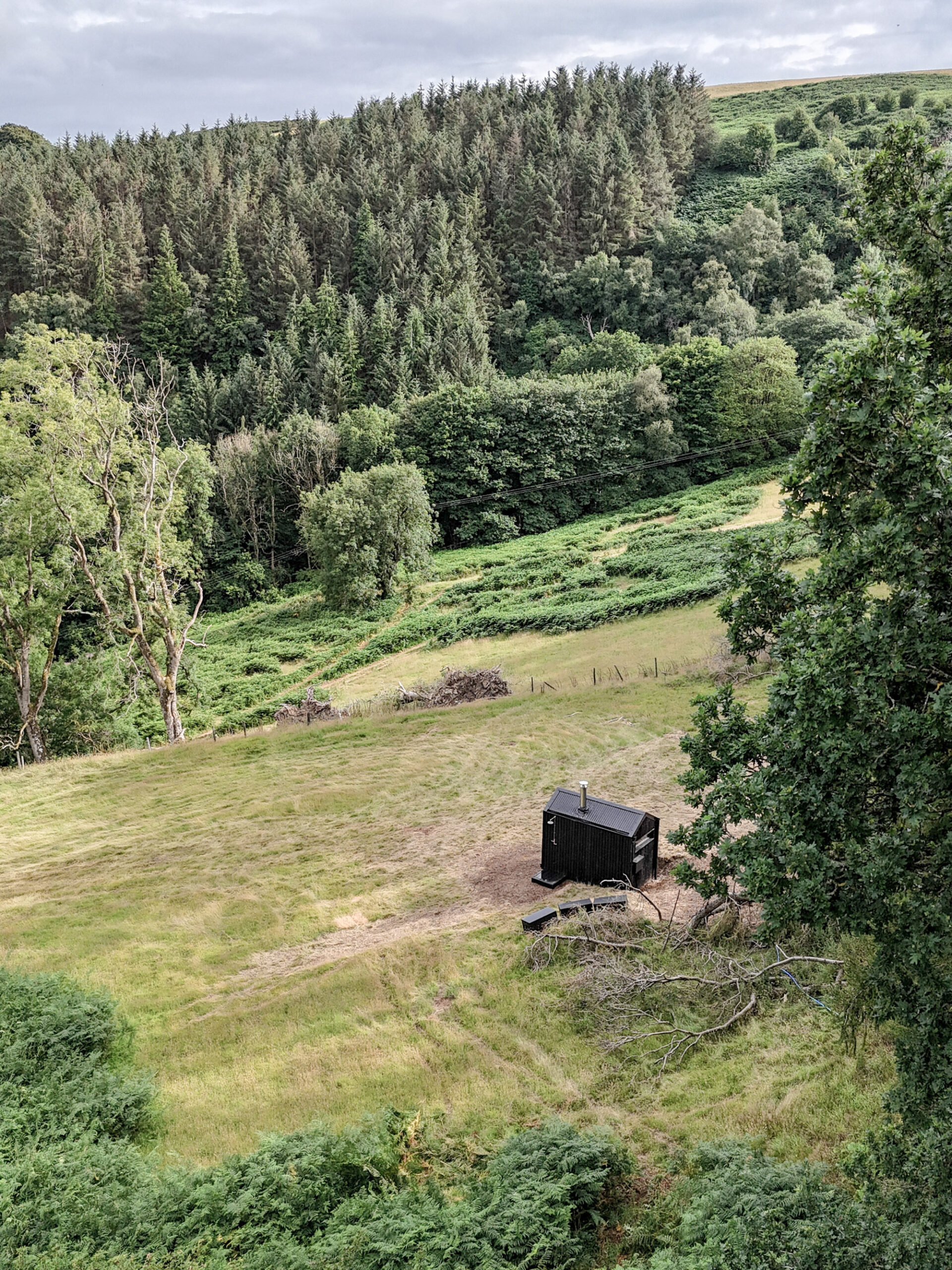 Cabin in a secluded hillside location with stunning views of Dee Valley and the mountains of North Wales.