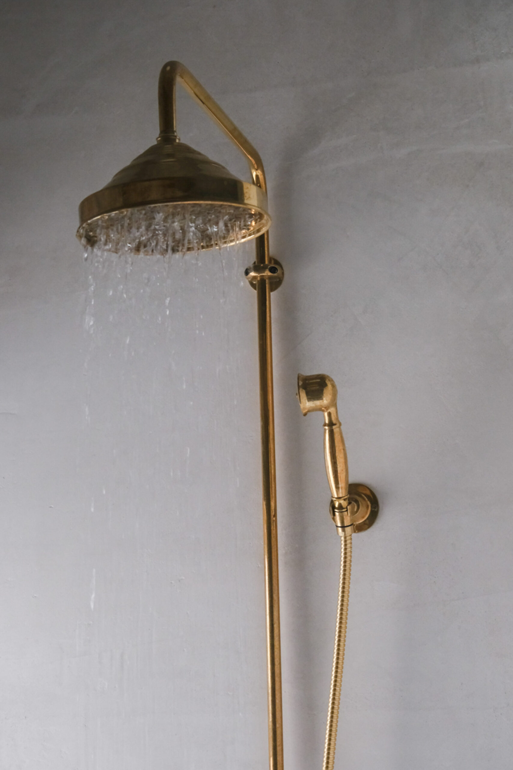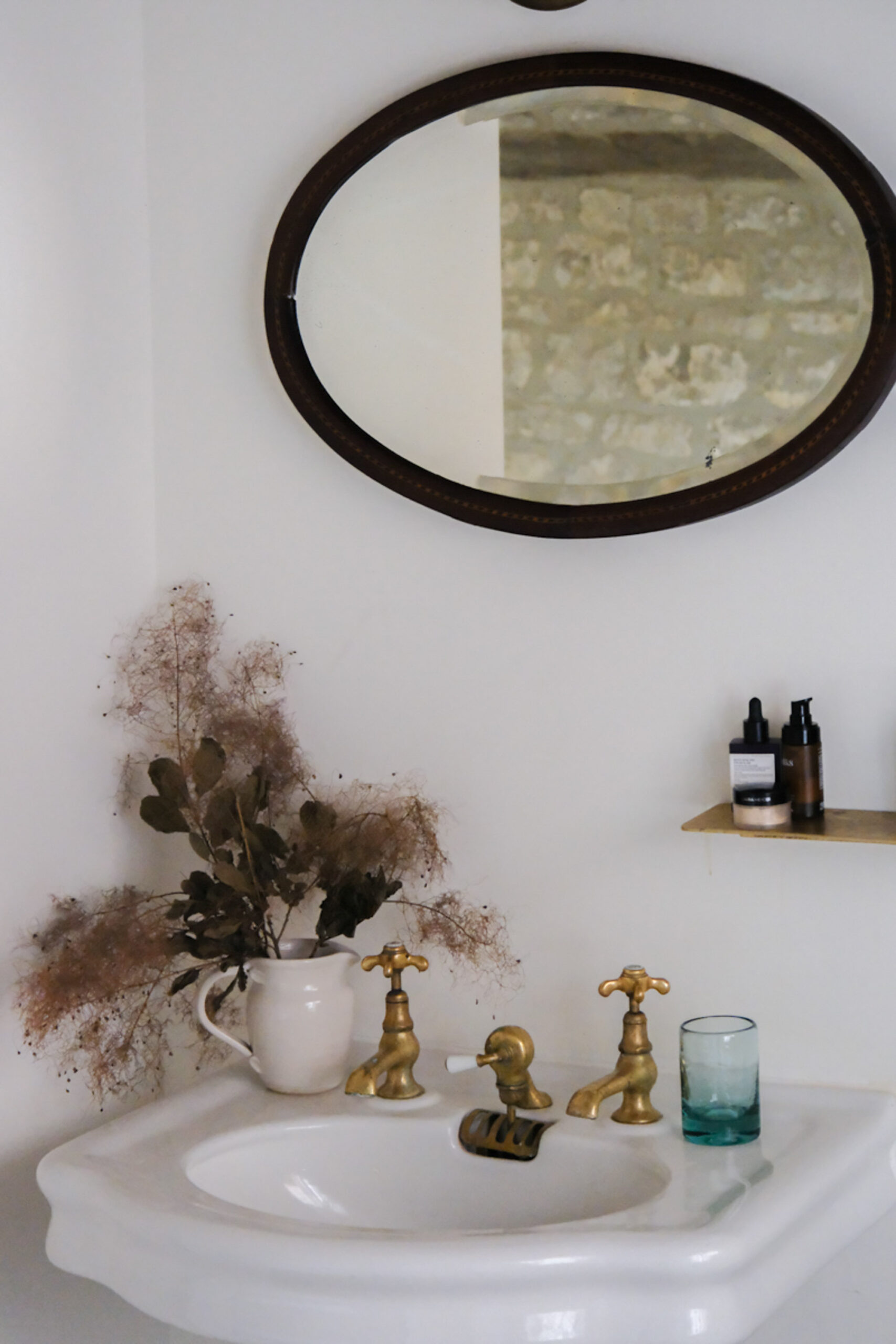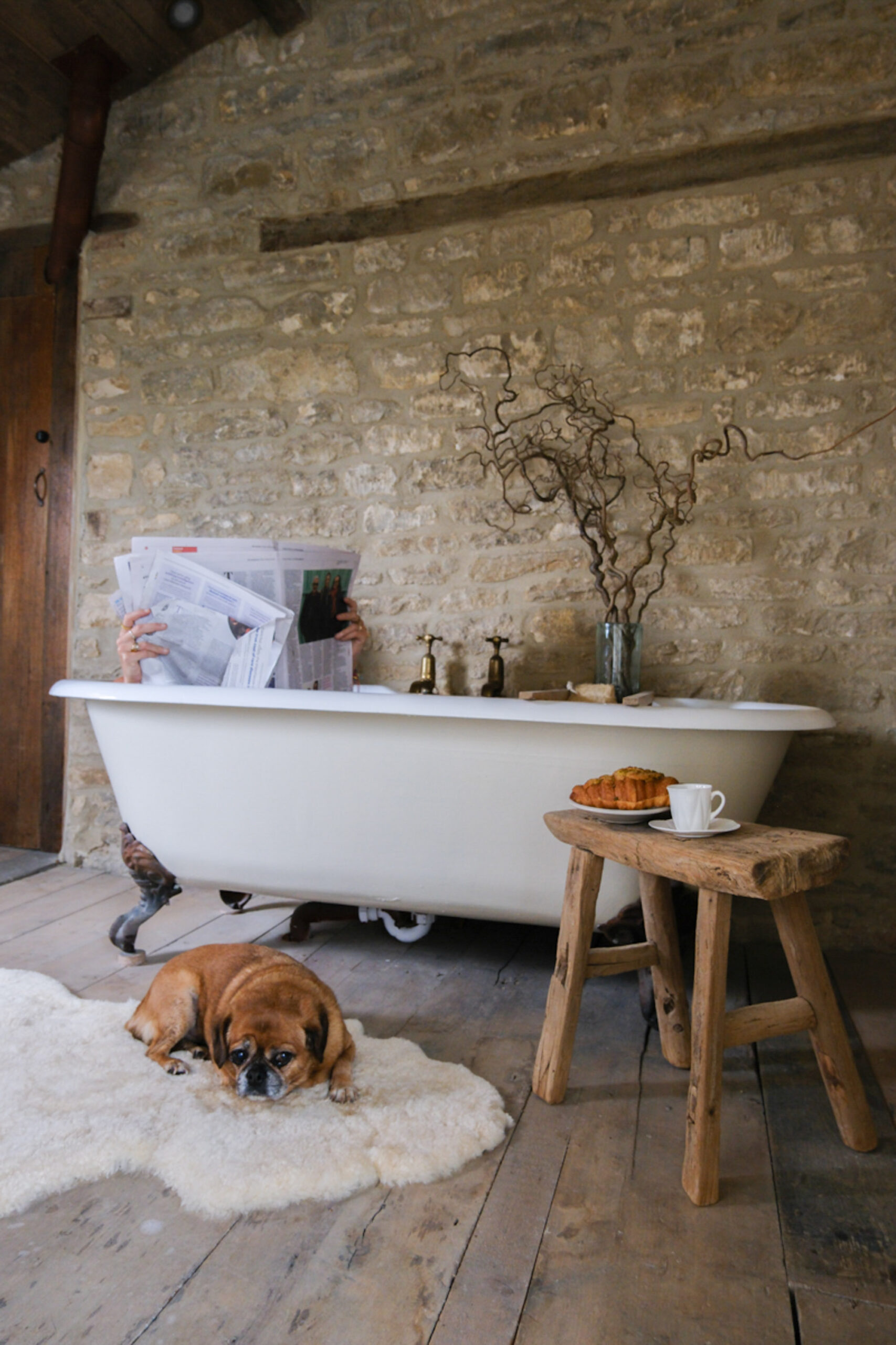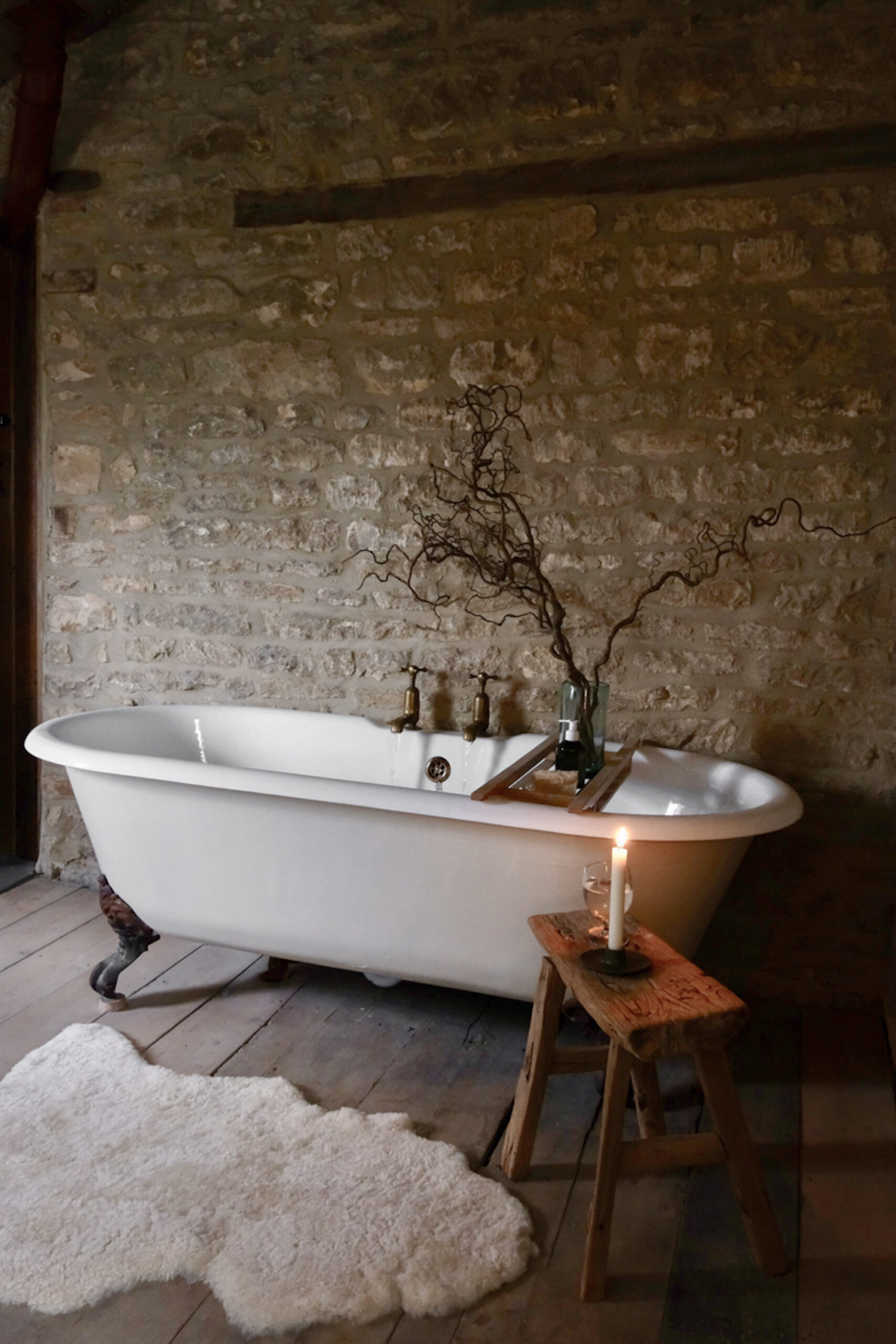 The stone-walled bathroom, which pairs a glorious old cast-iron tub with a generous shower and unlacquered brass fittings.