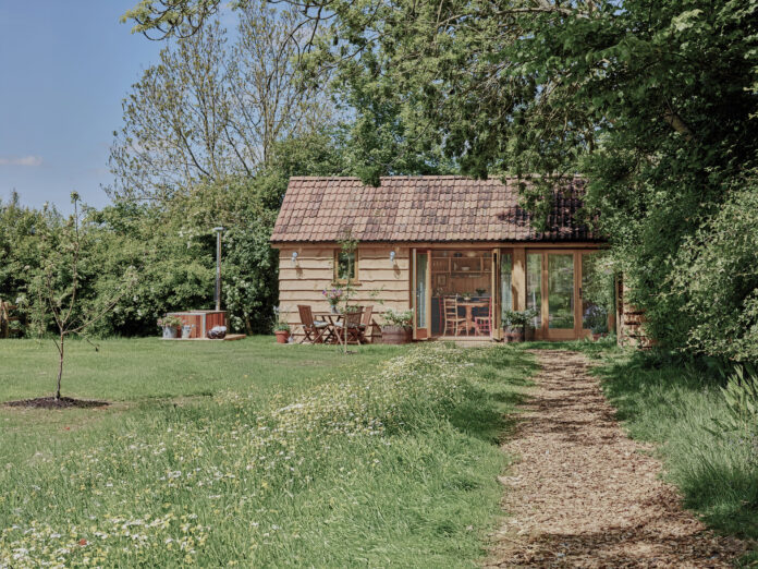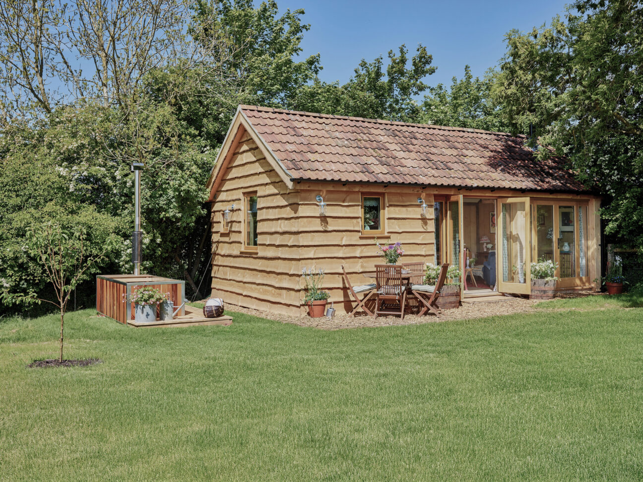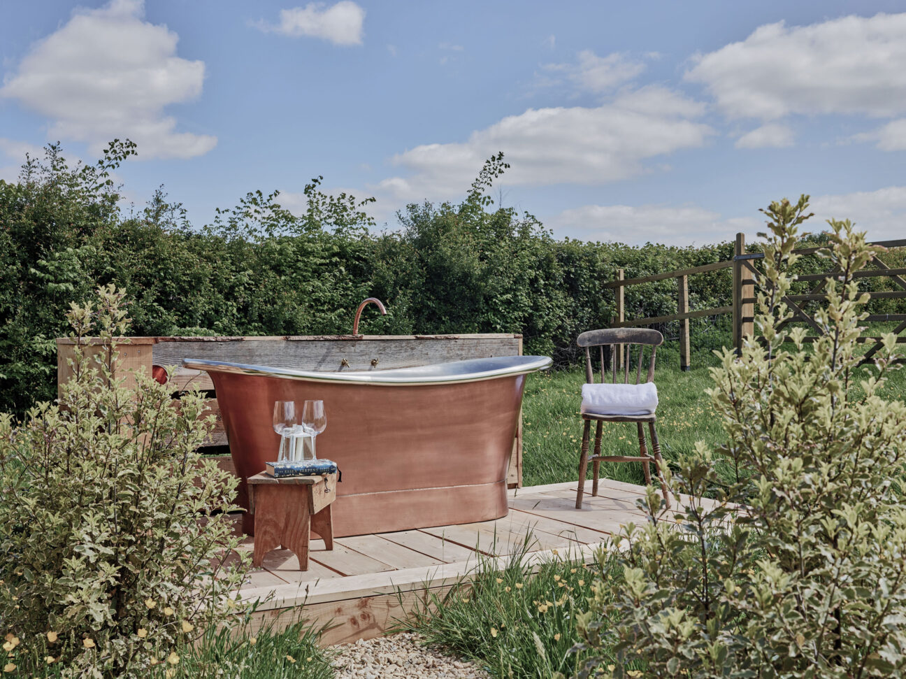 The romance of the Lambing Shed – once home to generations of Somerset lamb, and now the most beautiful, secluded space, with a bath under the apple trees.