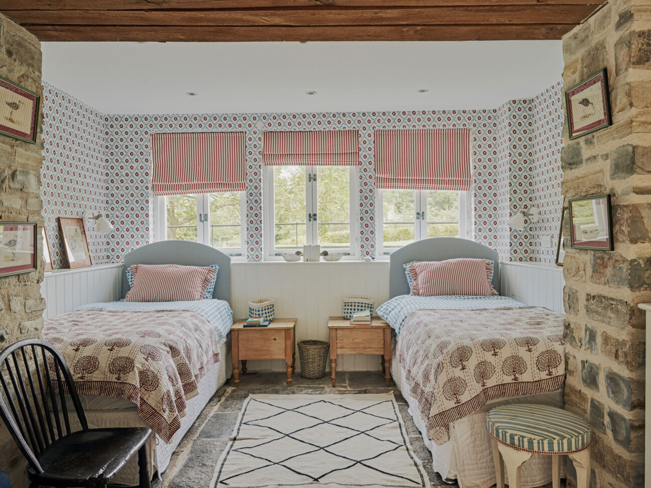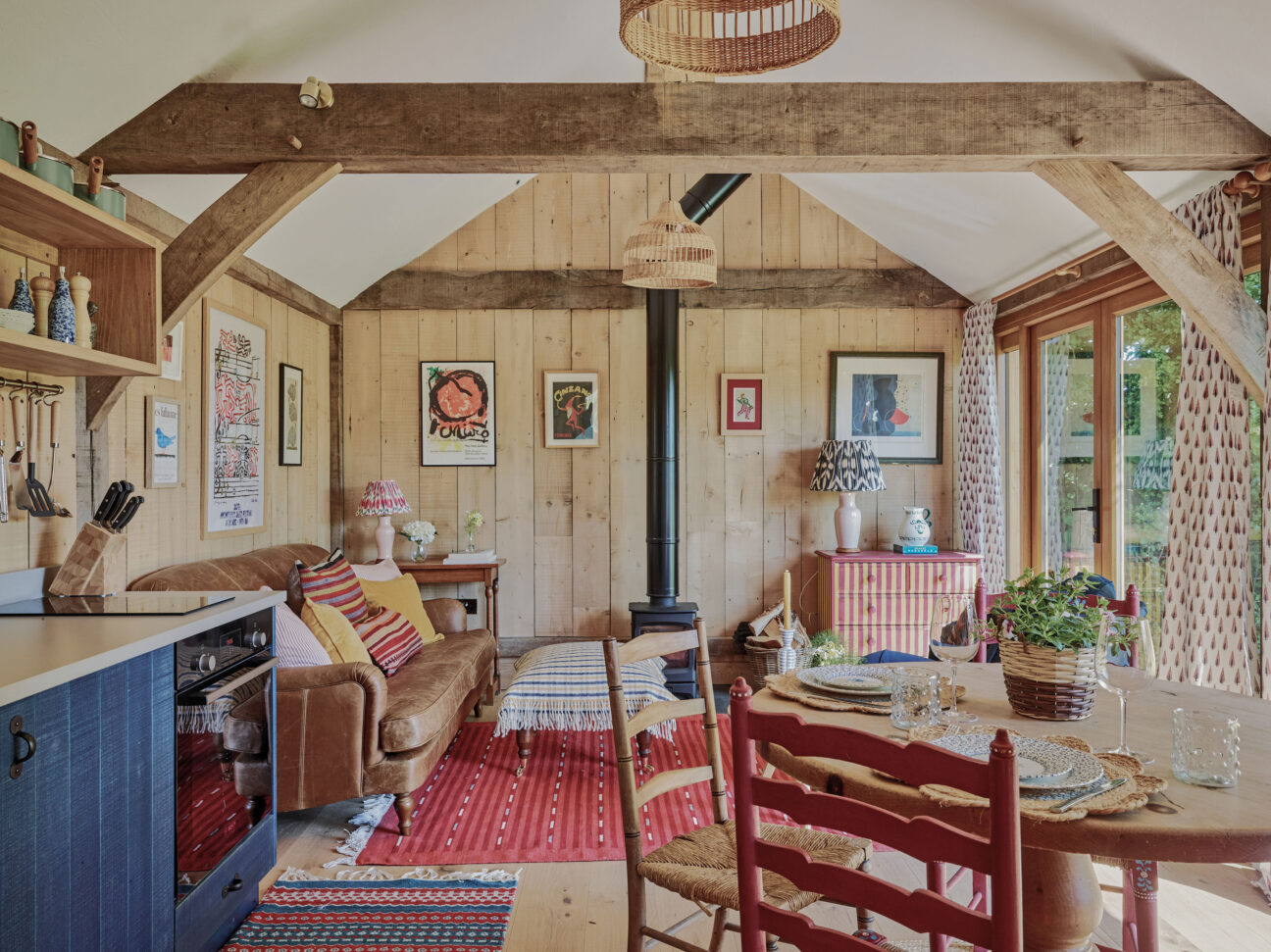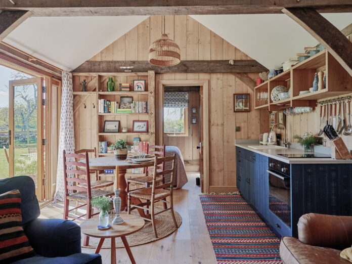 - Coach House (sleeps 4-5, dog friendly). Open-plan barn conversion with 2 bedrooms (kingsize + ensuite bathroom with tub; superking/twin with separate wet room). Open-plan living space with kitchen, dining table, lounge with woodburner, library and private paddock garden. Kitchen (fridge, freezer, induction hob, oven, coffee machine, dishwasher, microwave, washing machine and basic supplies). TV with Sky, WiFi, guitar, and kids’ toys.