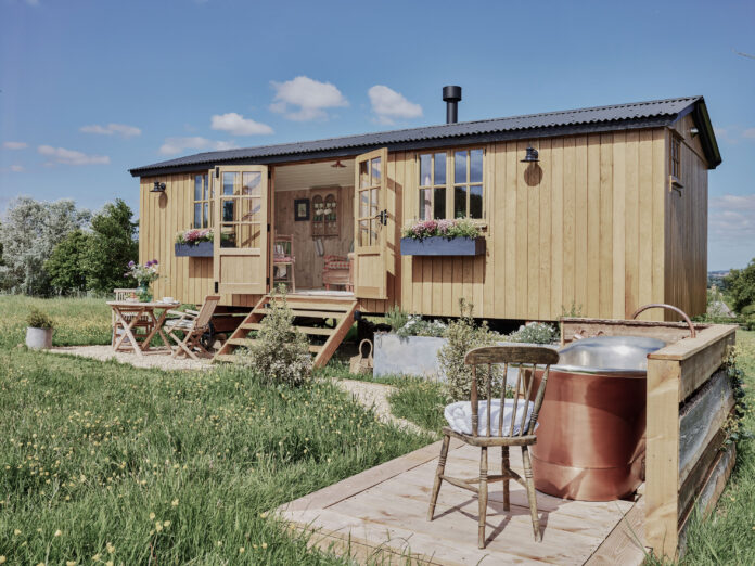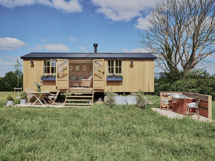 Shepherd hut with kingsize bed, outdoor bathtub and firepit. No WiFi. Sleeps 2. No dogs.