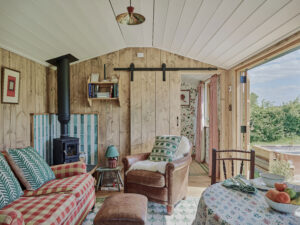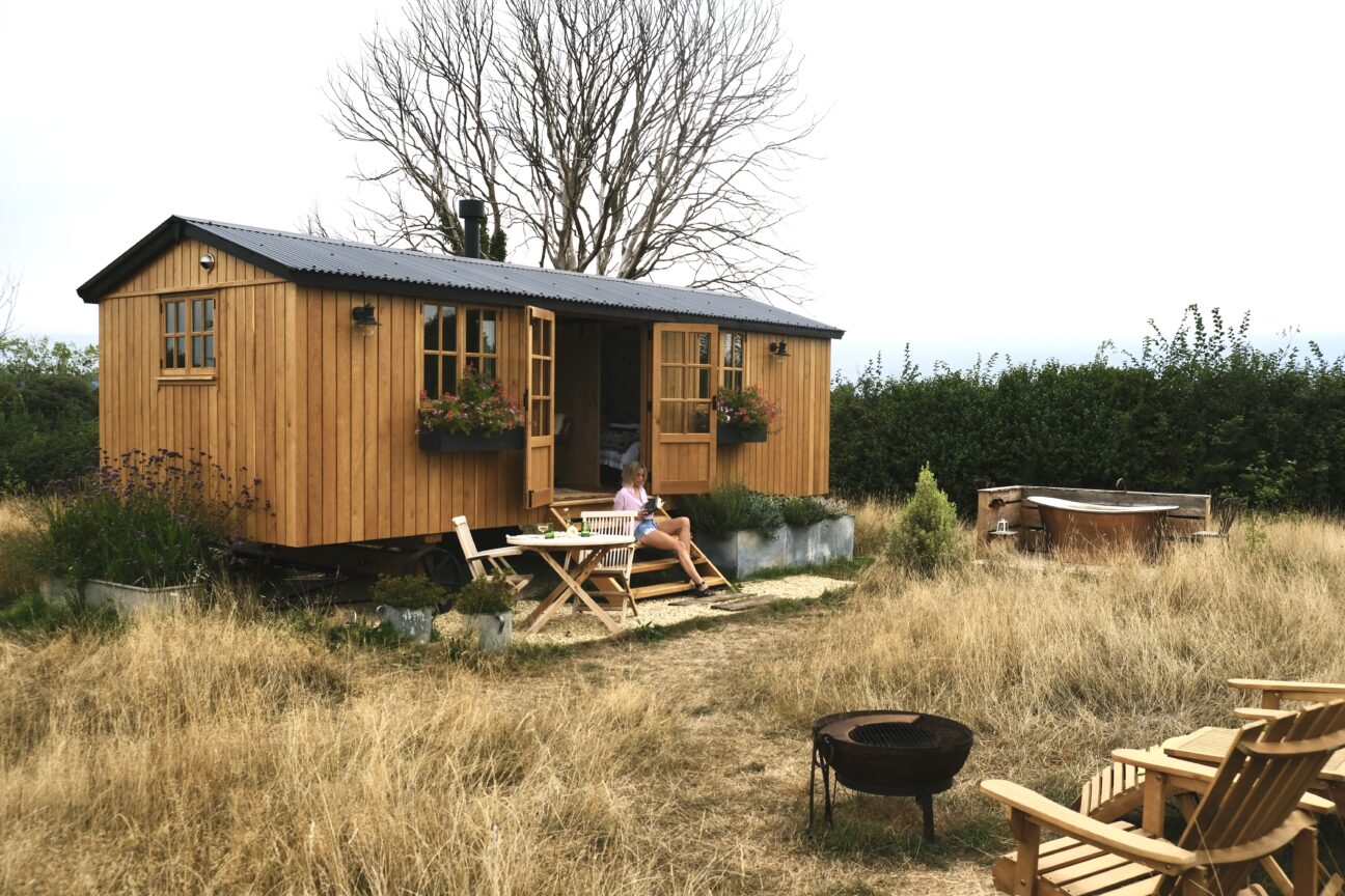 - Vine Hut (sleeps 2, no dogs). Shepherd hut with kingsize bed, bijou shower bathroom, kitchen (fridge/freezer, induction hob, oven, coffee machine and basic supplies), living space with woodburner. Outdoor bathtub and firepit. No WiFi.