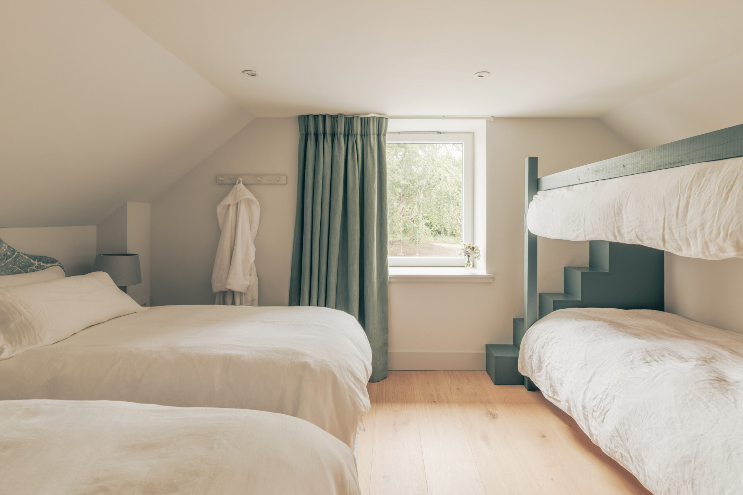 - Ground floor: super-king bedroom and ensuite bathroom with tub; kingsize bedroom and neighbouring bathroom with shower. Upstairs, twin bedroom with additional double bunk