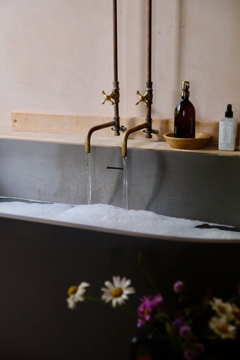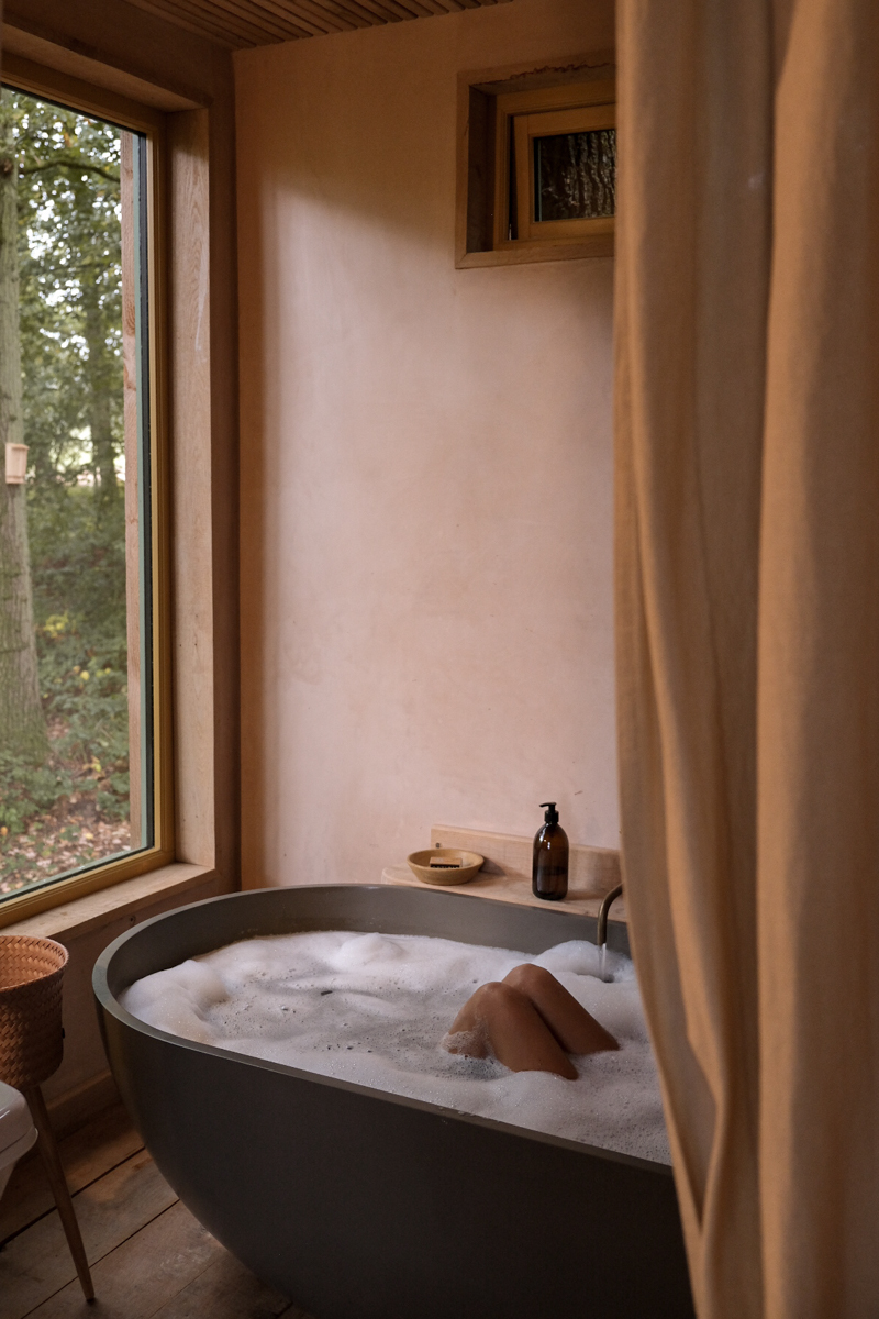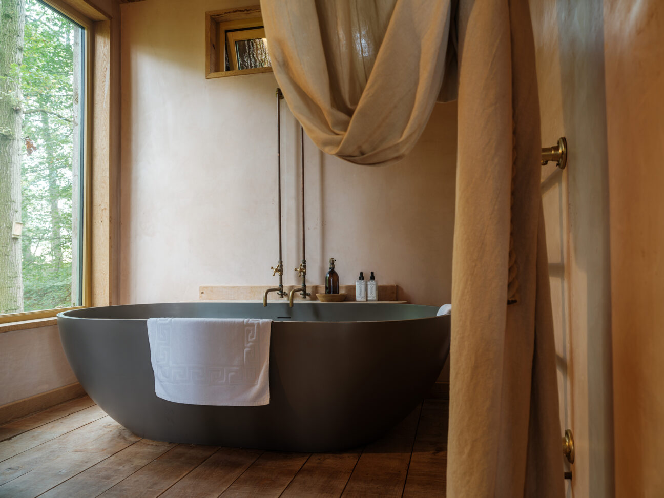 Harriet: Because the bare bones of it are really humble, wherever we could we picked the luxury option. I like that juxtaposition of those two things, and I think other people do as well. You don’t want to sleep on like a hemp mattress with a sheepskin to warm your cockles all night – you know, you have to be realistic about what people are used to. And then go above and beyond and hopefully give them those touchpoints and those experiences that are more luxurious than they’ve got at home. I did quite carefully choose that bath because I looked at a lot of ceramic and just nothing felt right for a treehouse.