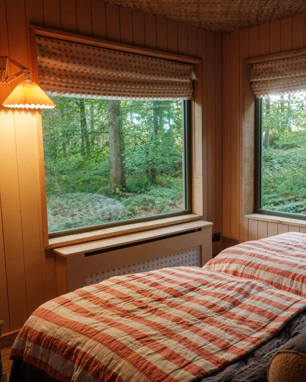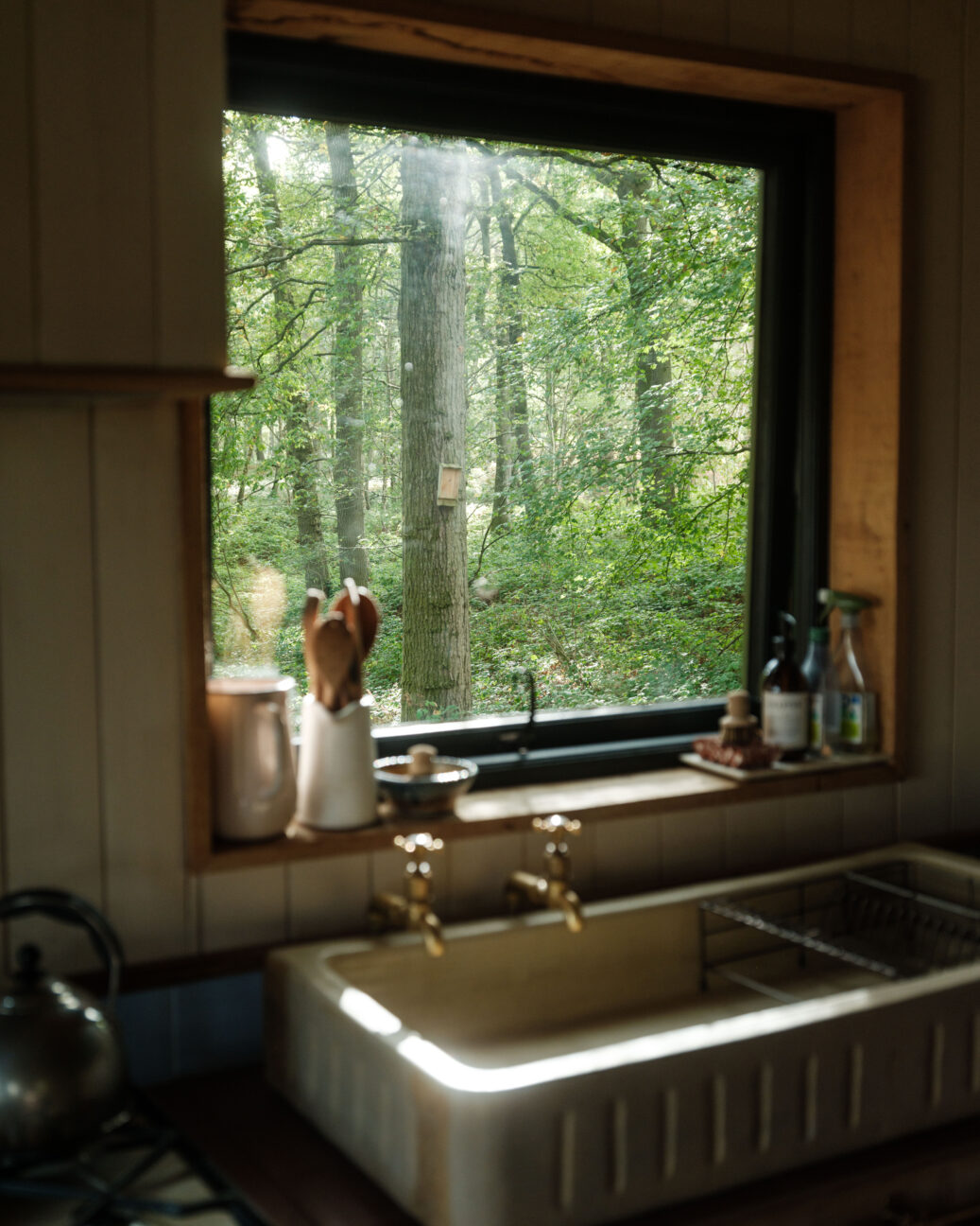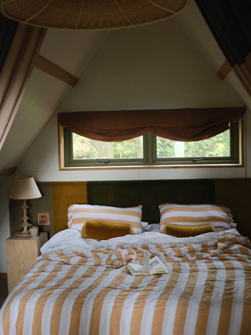 Harriet: Because the bare bones of it are really humble, wherever we could we picked the luxury option. I like that juxtaposition of those two things, and I think other people do as well. You don’t want to sleep on like a hemp mattress with a sheepskin to warm your cockles all night – you know, you have to be realistic about what people are used to. And then go above and beyond and hopefully give them those touchpoints and those experiences that are more luxurious than they’ve got at home. I did quite carefully choose that bath because I looked at a lot of ceramic and just nothing felt right for a treehouse.